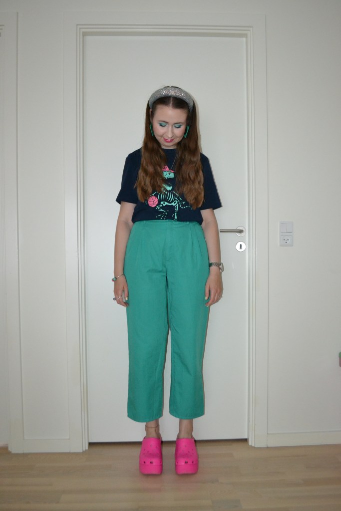 (T-shirt – Adidas Originals, denim jacket – H&M, flower pin – NA-KD, trousers – second hand, shoes – Crocs)
