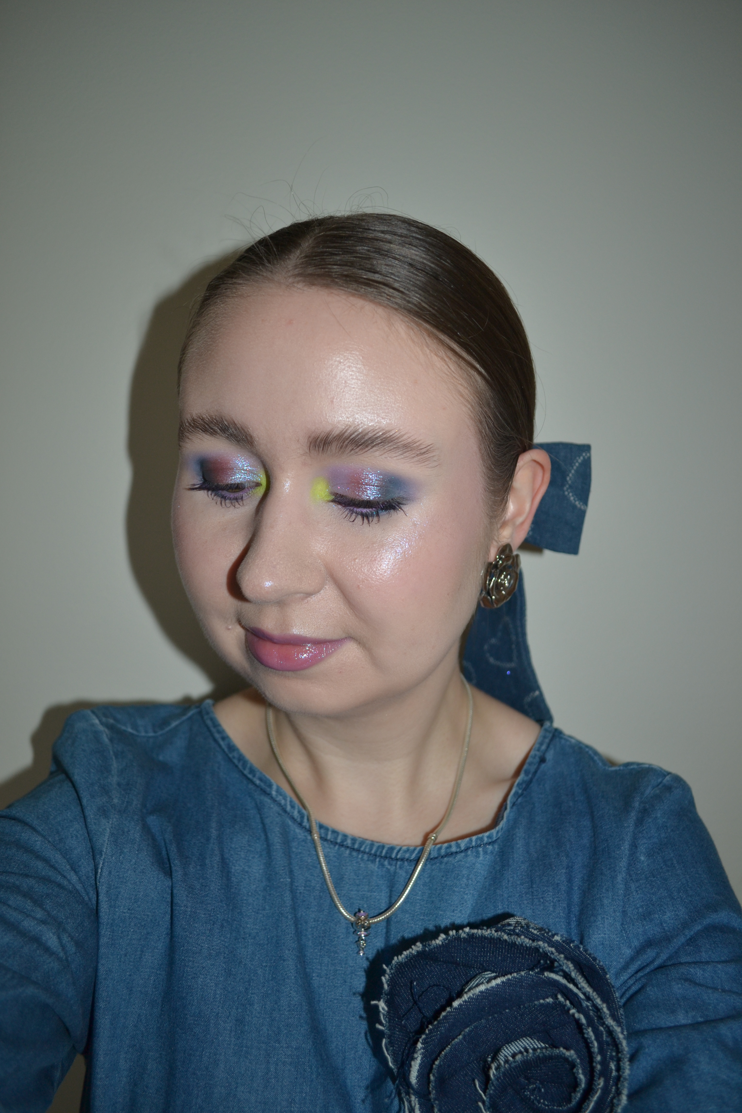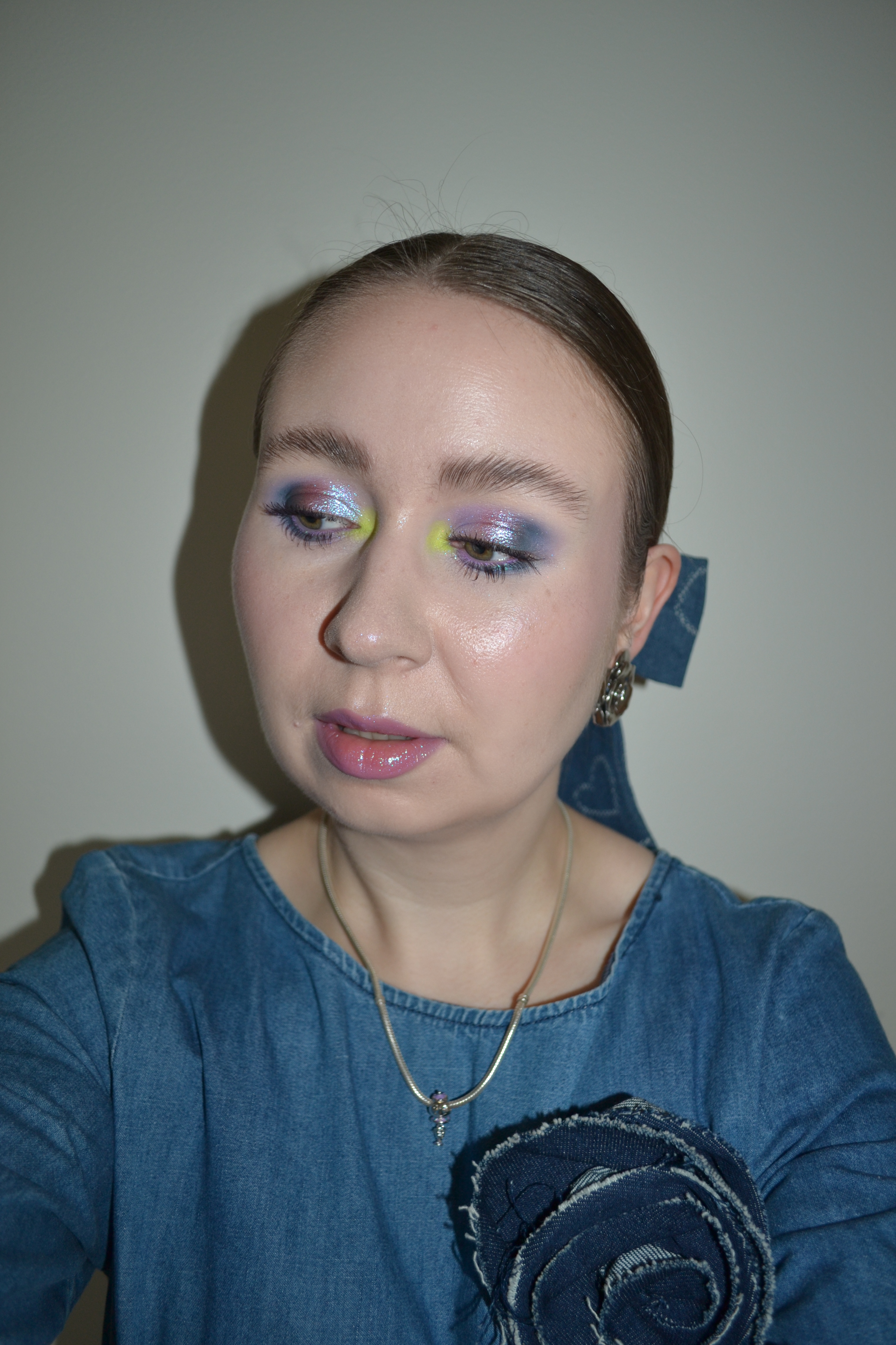 (Base: primer – e.l.f Cosmetics Power Grip primer, foundation – Anastasia Beverly Hills Beauty Balm Serum Boosted skin tint (shade: 2), concealers – Rare Beauty Positive Light under eye brightener (shade: Light) + Huda Beauty #FAUXFILTER Luminous Matte liquid concealer (shade: 1.3G Marshmellow), powders – Fenty Beauty Bright Fix Instant Brightening + Blurring powder (shade: Lavender 01) + e.l.f. Cosmetics Halo Glow setting powder in Light. Face make-up: bronzer – Whats Up Beauty Cheeque Terre bronzer in 10 Light, blush + highlighter – Gourmande Girls Mermaid Magic face palette (shades: Neptune (blush) + Lagoon + La Mer (highlighters)). Eye make-up: base – Wet n Wild Megalast eyeshadow primer, eyeshadows – Essence eyeshadow in 20 Cream + Bellabeautébar Ocean Jewel palette (shades: Flor de la Mar + Shipwreck + Colorful Moon + Oyster + Shark’s Eye + Luminescence), mascara – Maybelline Lash Sensational Sky High mascara (shade: Plum Twilight), eyeliner – Colourpop Pretty Guardians Sailor Moon BFF Crème gel liner in Azabu-Juban. Eyebrows: NYX Lift & Snatch! Brow Tint Pen in Ash Brown + e.l.f. Cosmetics Brow Lift. Lips: MAC Liptensity lip pencil in Galaxy Grey + Fenty Beauty Gloss Bomb Stix shimmer in Icy Amethy$t 04)