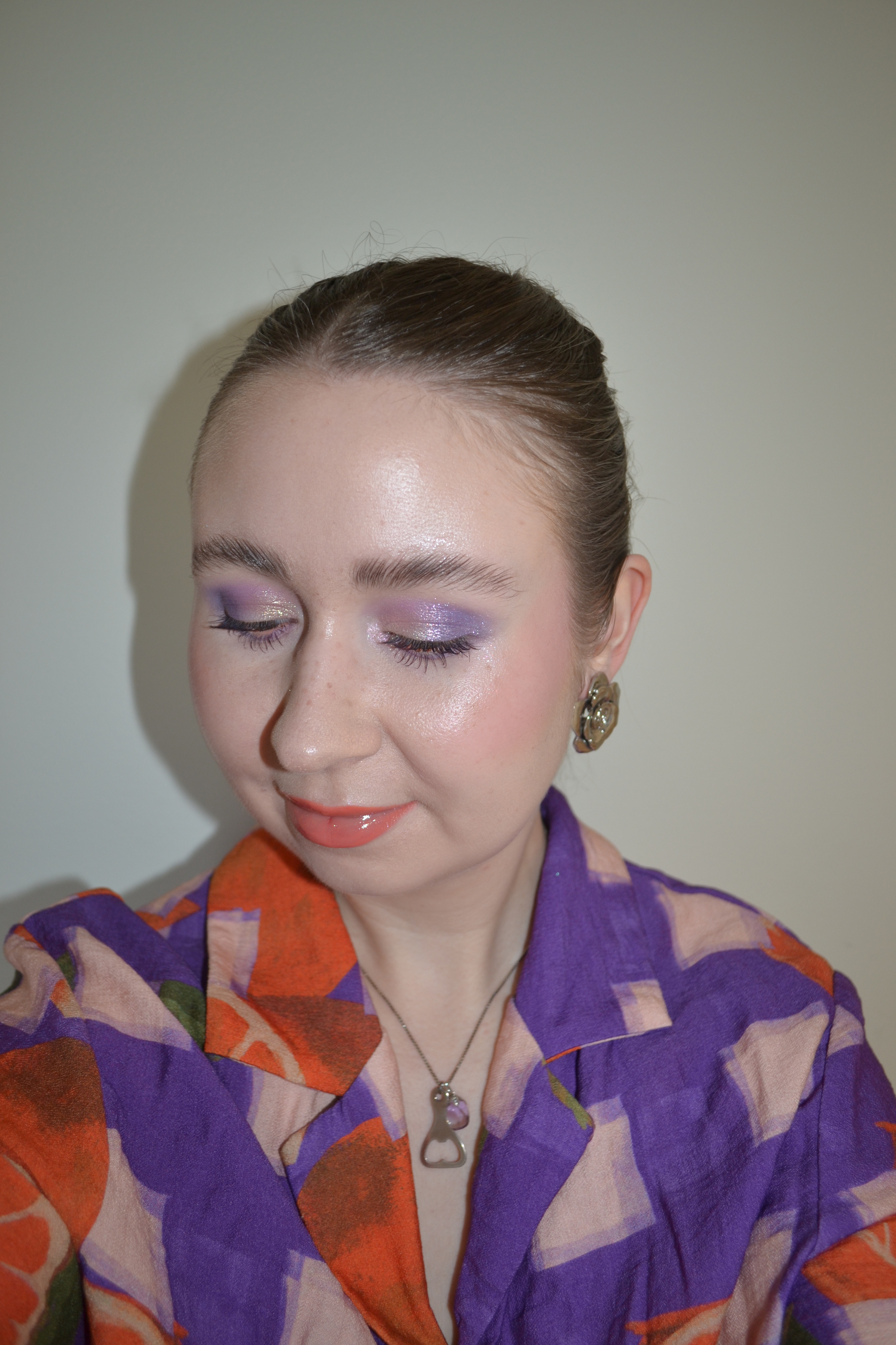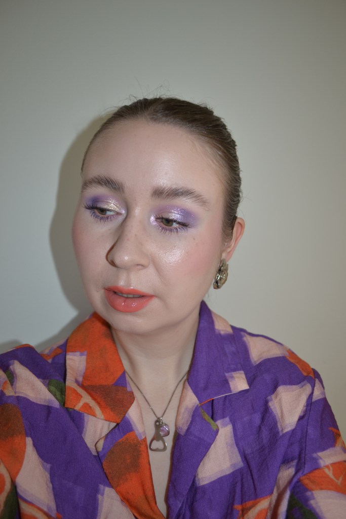 (Base: primer – Iconic London Underglow blurring primer, foundation – Anastasia Beverly Hills Beauty Balm Serum Boosted skin tint (shade: 2), concealers – Rare Beauty Positive Light under eye brightener (shade: Light) + Fenty Beauty We’re Even hydrating longwear concealer (shade: 120N), powders – Fenty Beauty Bright Fix Instant Brightening + Blurring powder (shade: Lavender 01) + e.l.f. Cosmetics Halo Glow Powder Filter pressed powder (shade: Fair Neutral Cool), freckles – either Essence Got A Crush On Apricots freckles pen (shade: 01 Après Apricots) or Nabla Freckle Maker (I forgot to write it down). Face make-up: bronzer – Rare Beauty Warm Wishes Effortless bronzer in Power Boost, blush – NYX Fat Cheeks blush in 8 Blueberry Burst, highlighter – Catrice Midnight Sun Jelly Glow Stick in C01 Bright & Breezy. Eye make-up: base – Wet n Wild Megalast eyeshadow primer, eyeshadows – Essence eyeshadow in 20 Cream + eyeshadows – Oden’s Eye Winter Älva palette (shades: Snowy + Woodstove + Festive + Icy + Cool), mascara – Maybelline Lash Sensational Sky High mascara (shade: Plum Twilight), eyeliner – Colourpop BFF Crème gel liner in Peach Fuzz. Eyebrows: NYX Lift & Snatch! Brow Tint Pen in Ash Brown + e.l.f. Cosmetics Brow Lift. Lips: MAC Fruit Cocktail lip pencil + Catrice Summer Lips lip glaze in C02 Orange Spritz)