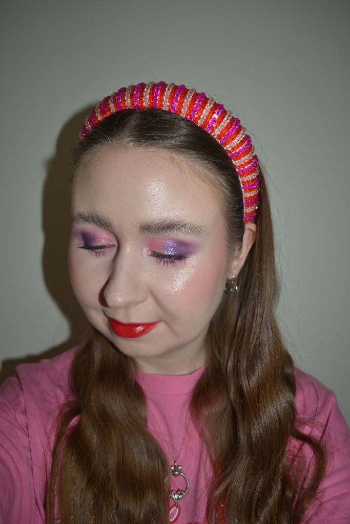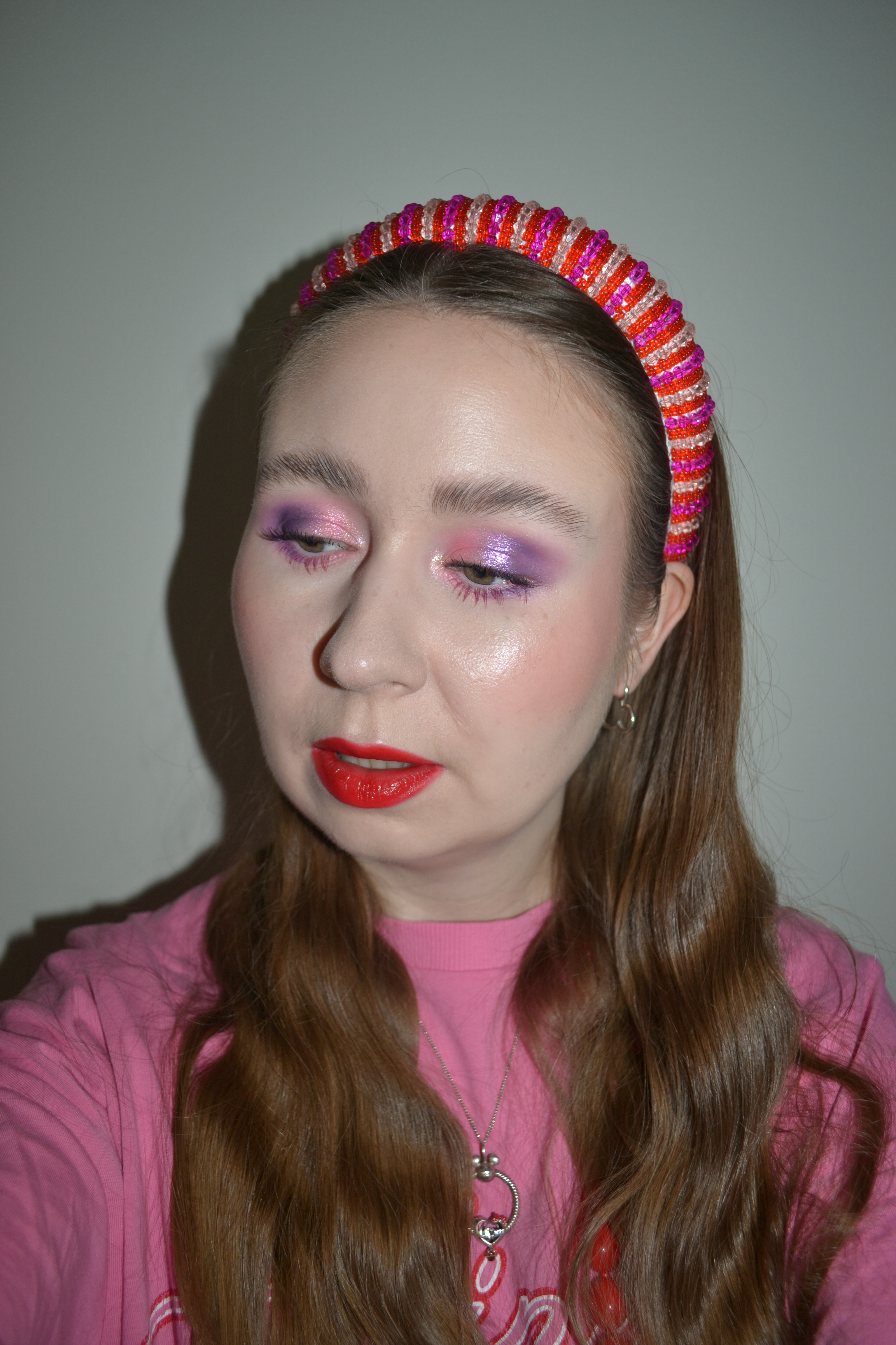 (Base: primer – e.l.f Cosmetics Power Grip primer, foundation – Rare Beauty Positive Light tinted moisturizer (shade: 14W), concealers – Smashbox x Becca Under Eye Brightening Corrector in Fair/Light + Huda Beauty #FAUXFILTER Luminous Matte liquid concealer (shade: 1.3G Marshmellow), powders – Fenty Beauty Bright Fix Instant Brightening + Blurring powder (shade: Lavender 01) + e.l.f. Cosmetics Halo Glow setting powder in Light. Face make-up: bronzer – Colourpop Super Shock bronzer in Get Sandy, blush – Rare Beauty Soft Pinch matte bouncy blush in Grateful, highlighter – Colourpop Super Shock highlighter in Candy Floss. Eye make-up: base – MAC Pro Longwear Paint Pot in Painterly, eyeshadows – Oden’s Eye x Morgan Turner Love Language palette (shades: Service + Amor + Date Night + Gifts + Cuddles + Heart), mascara – Maybelline Lash Sensational Sky High mascara (shades: Plum Twilight + Pink Air), eyeliner – Catrice Kohl Kajal waterproof in 170 Candy Rose. Eyebrows: NYX Lift & Snatch! Brow Tint Pen in Ash Brown + e.l.f. Cosmetics Brow Lift. Lips: MAC Centre of Attention lip pencil + MAC Macximal Sleek satin lipstick in Centre of Attention)