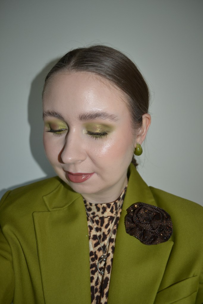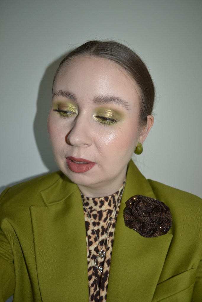 (Base: primer – e.l.f Cosmetics Power Grip primer, foundation – Rare Beauty Positive Light tinted moisturizer (shade: 14W), concealers – Rare Beauty Positive Light under eye brightener (shade: Light) + Danessa Myricks Beauty Yummy Skin Lift & Flex concealer (shade 2), powder – e.l.f. Cosmetics Halo Glow setting powder in Light. Face make-up: bronzer – Makeup By Mario SoftSculpt Transforming Skin Enhancer in Light, blush – Colourpop Shrek Lip and Cheek Balm in Fairytale Things, highlighter – MAC Skinfinish Lightstruck liquid highlighter in Lightscapade. Eye make-up: base – MAC Pro Longwear Paint Pot in Painterly, eyeshadows – Colourpop Shrek Beware Orge palette (shades: Better Out Than In + Shrek Happens + My Swamp + I’m Making Waffles! + What The Shrek? + Sir Knight + Layers), mascara – Rimmel Kind & Free mascara (shade: 02 Brown Black), eyeliner – Oden’s Eye Solmåne gel liner in 006 Green Tea. Eyebrows: NYX Lift & Snatch! Brow Tint Pen in Ash Brown + e.l.f. Cosmetics Brow Lift. Lips: Maybelline Lifter Liner in 09 Peaking + MAC Spirit lipstick + Colourpop Shrek Ultra Glossy Lip in Orge)