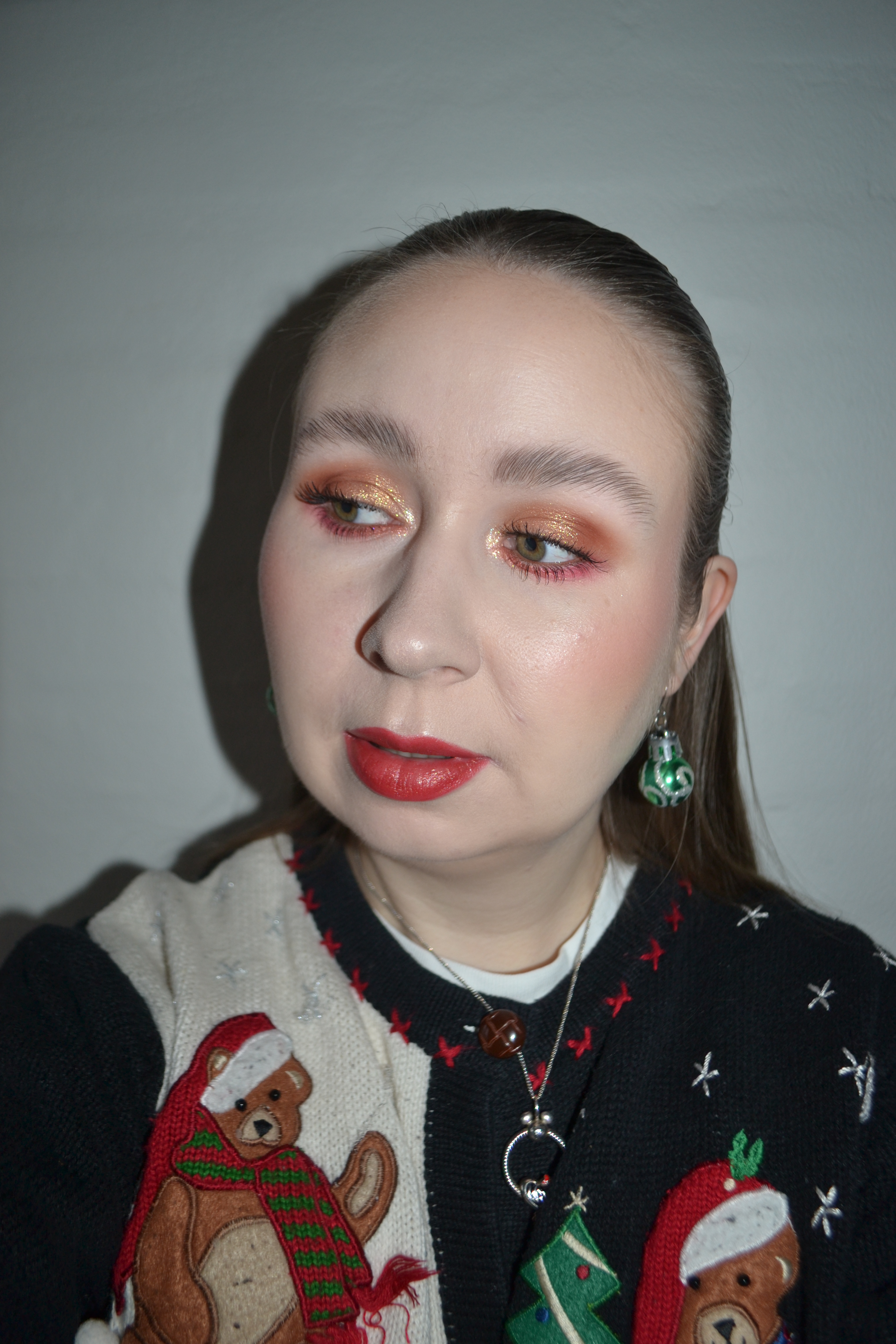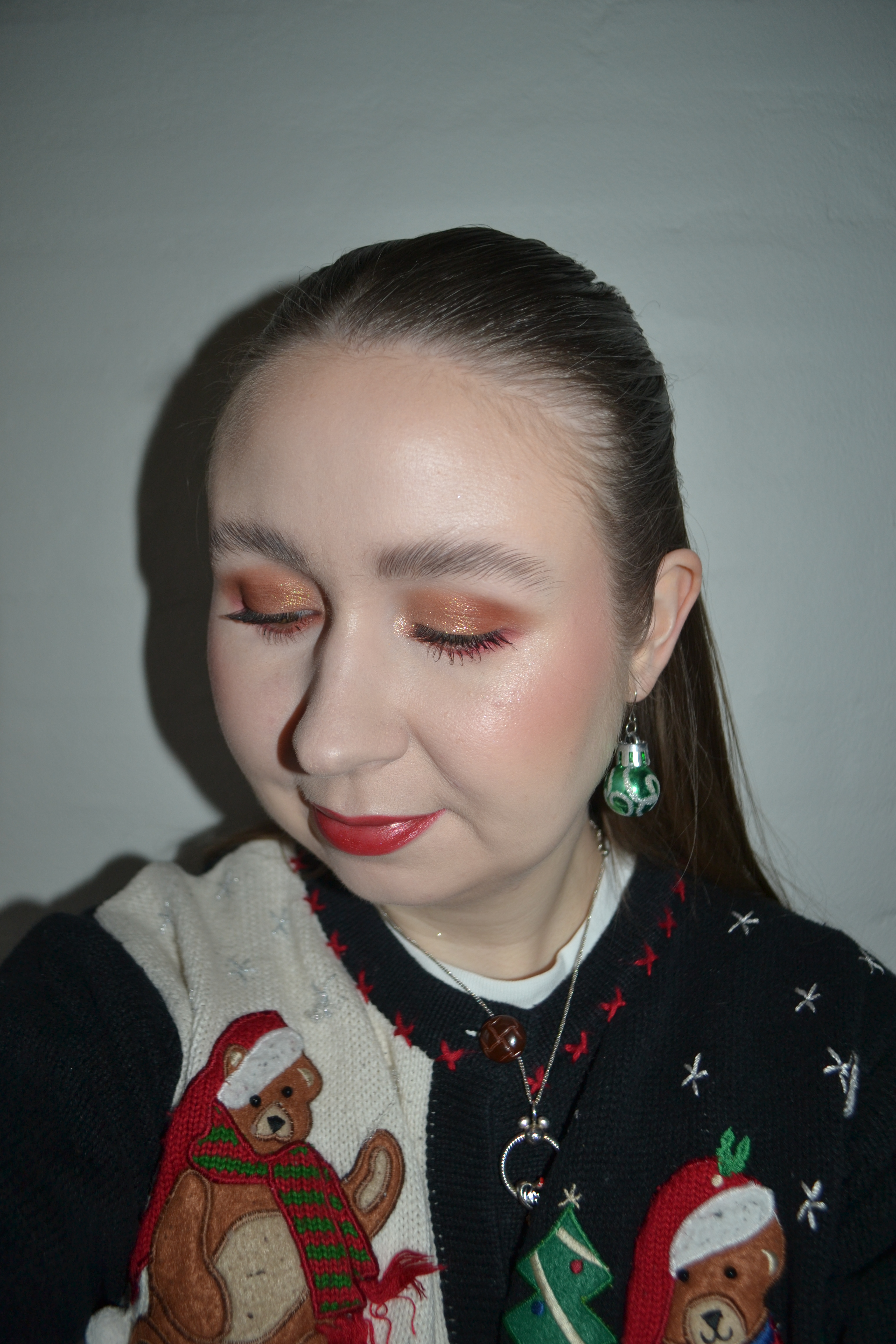 Here’s the make-up I wore with this outfit. I love wearing my Christmas-themed eyeshadow palettes throughout December, and I used the Oden’s Eye Snow Dream palette to create this pretty, warm eye look.