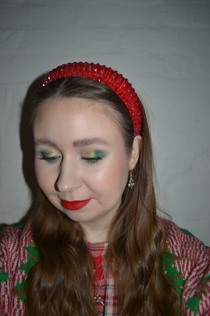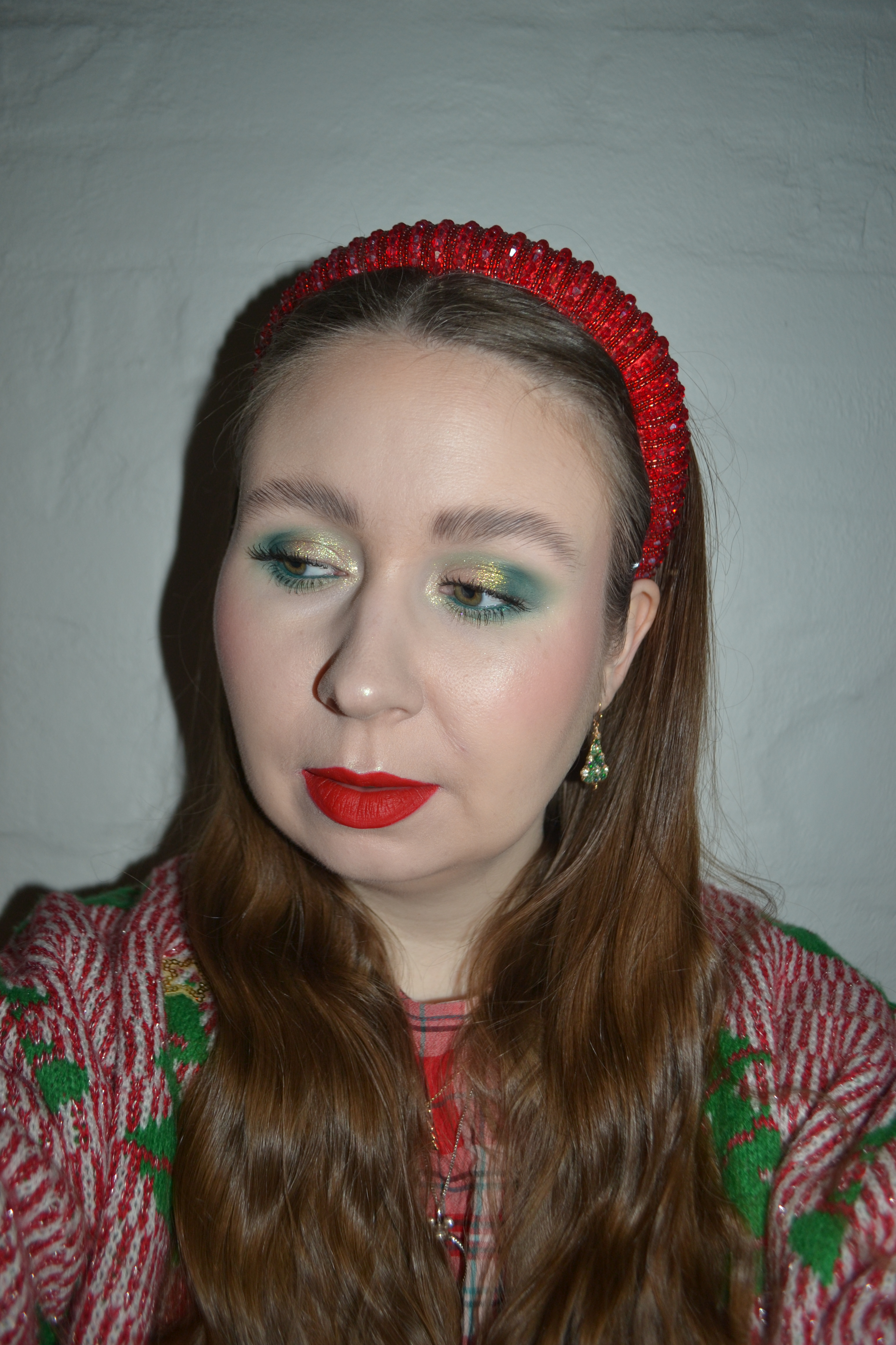 Here’s the make-up I wore with this outfit. I dug out another Oden’s Eye Christmas palette from a moving box to create this eye look. It’s the Merry Christmas palette, which was one of their first Christmas palettes, and it’s still my favourite Christmas palette from Oden’s Eye along side the Christmas Eve palette, which released the same year (I think it was i 2022).