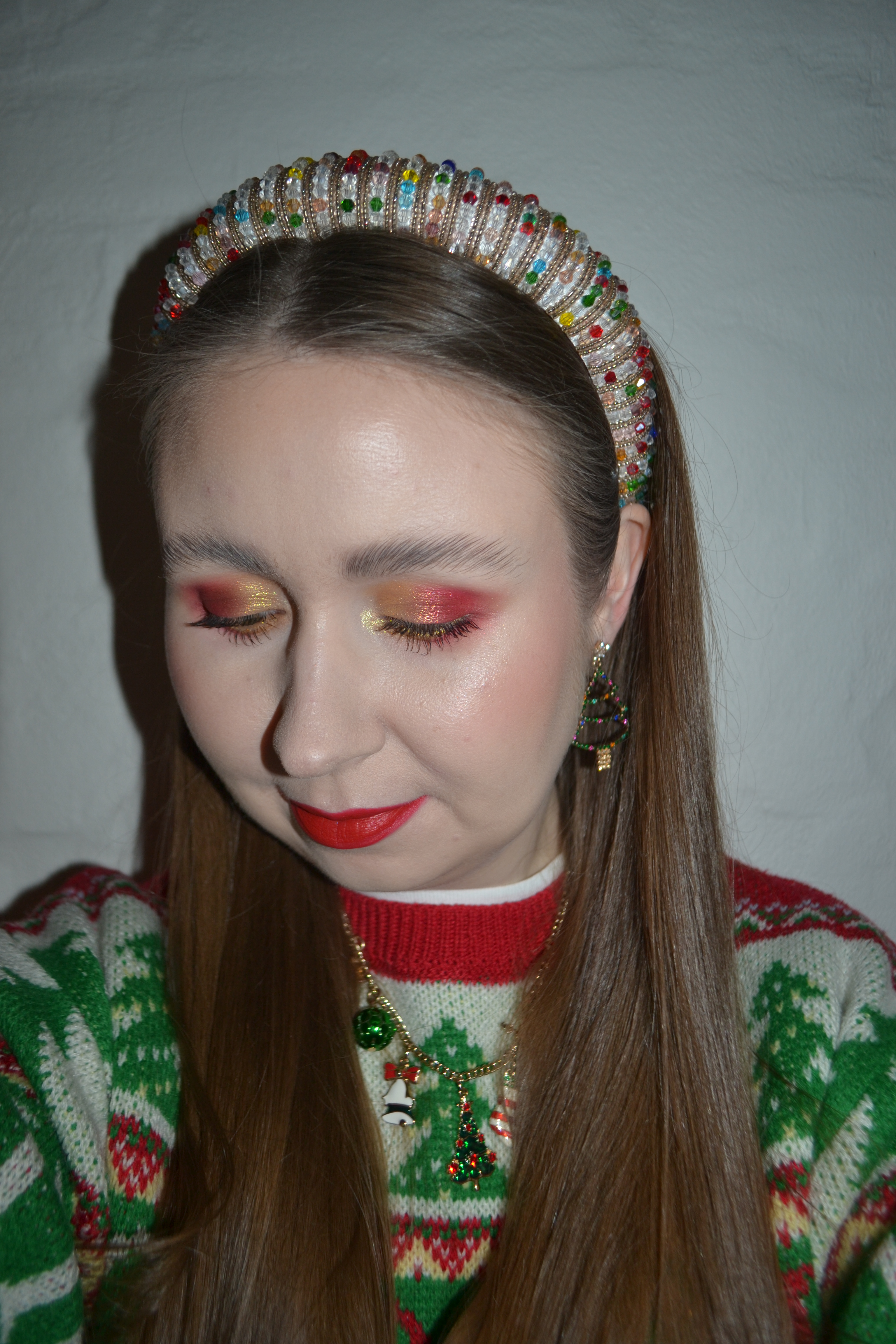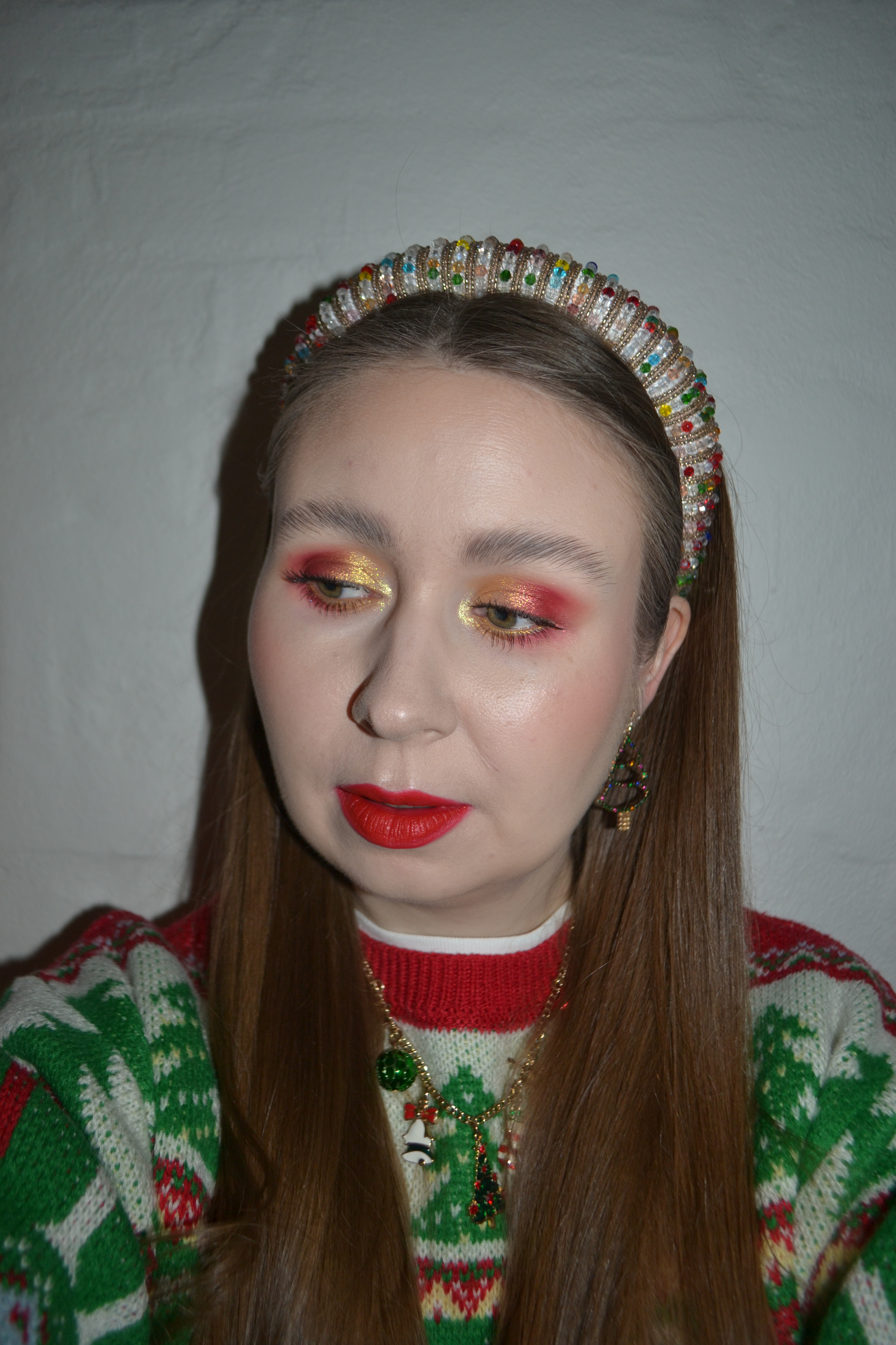 Here’s the make-up I wore with this outfit. It’s my first red and gold eye look of the Christmas season, and I think it turned out really pretty.