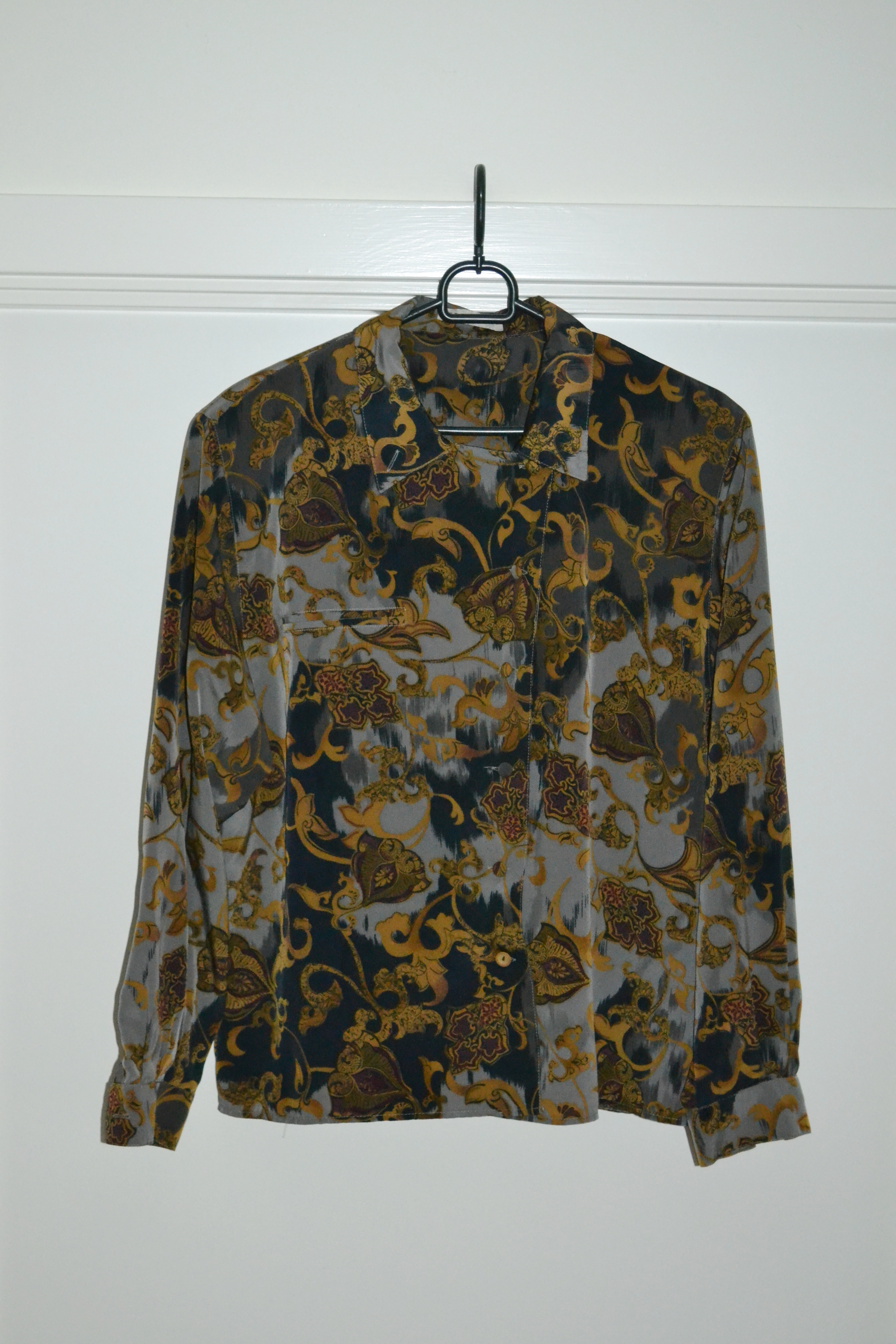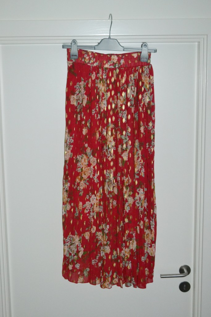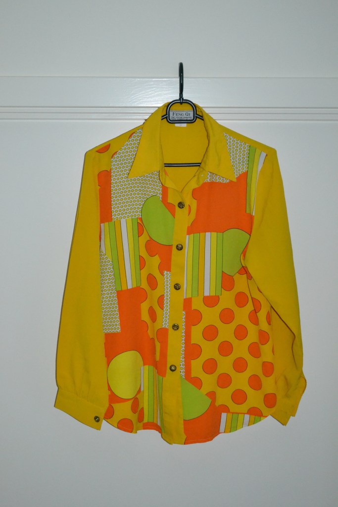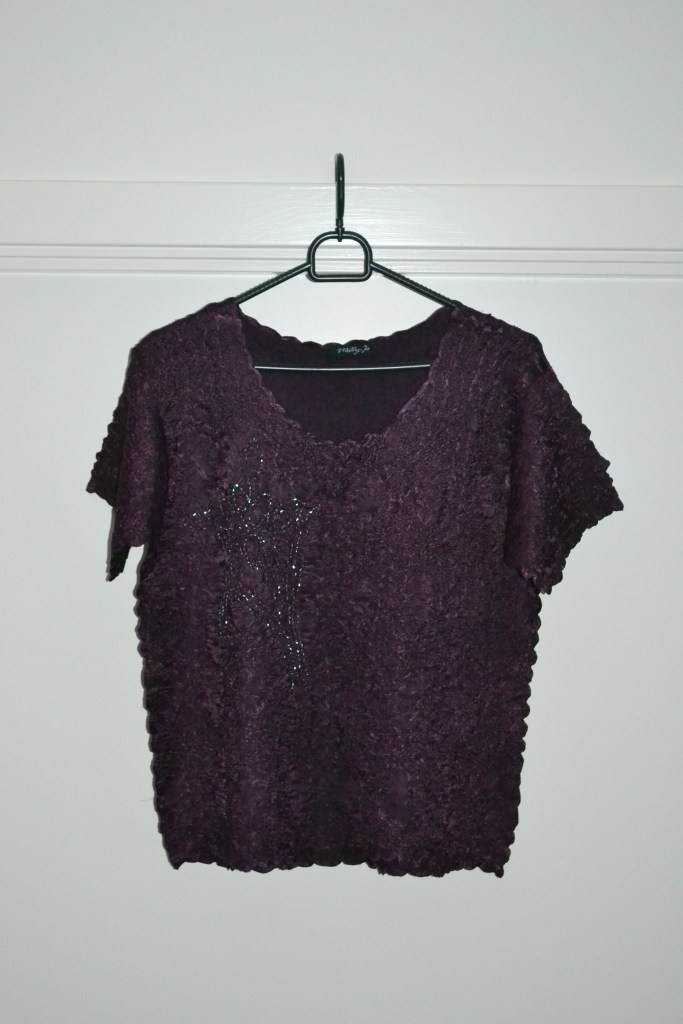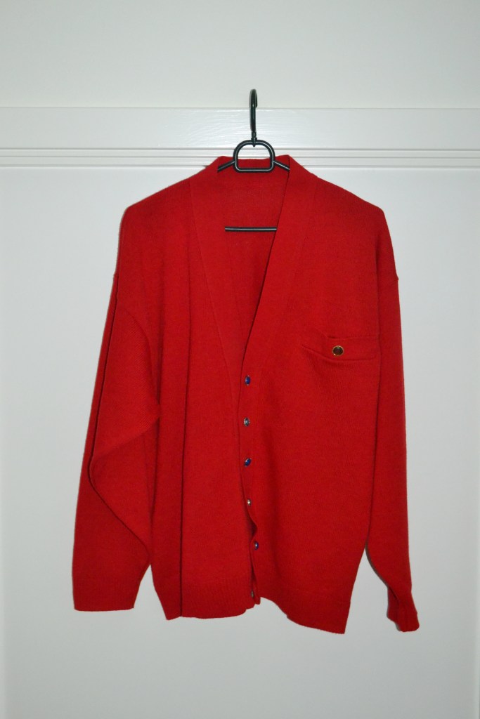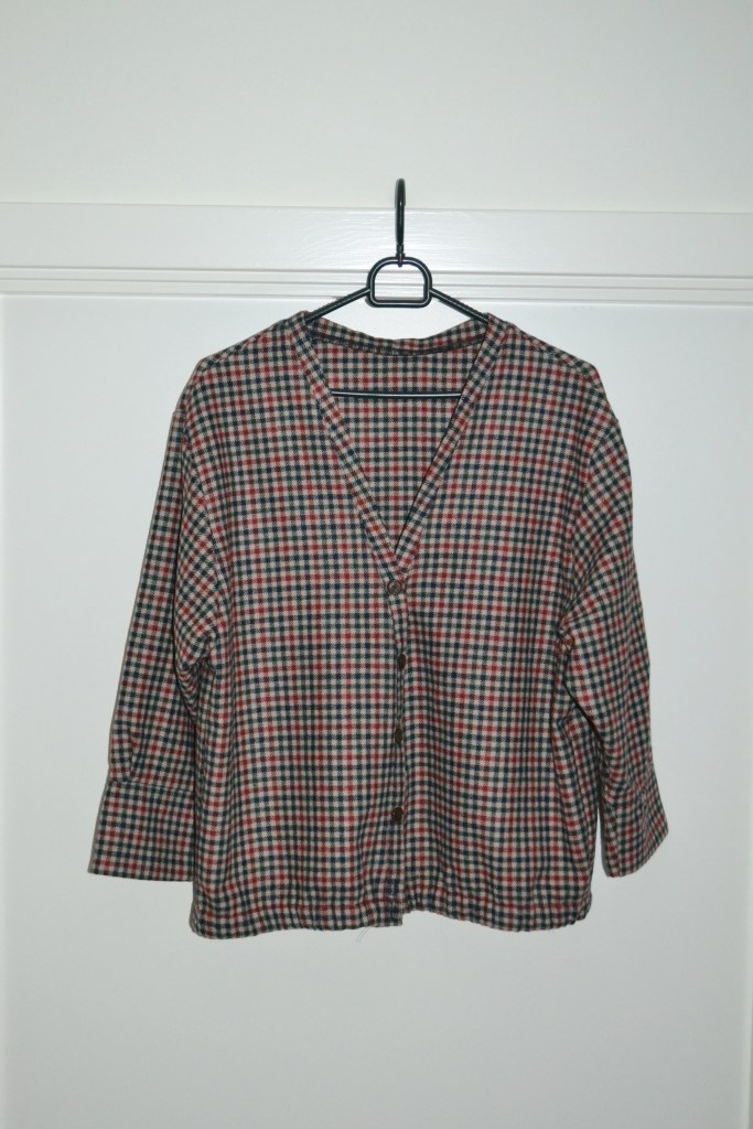 These are the other four tops that I found second hand. The oversized red cardigan is so nice, and I’ve also worn it this holiday season. And I have a weakness for second hand/vintage patterned shirts, and I think both the grey one and the yellow one are so fun, and I’m excited to style them up. I have an orange top in the same style and from the same brand as the dark purple one, and I think they really fun pieces. I love the texture, the shine, and the beading.