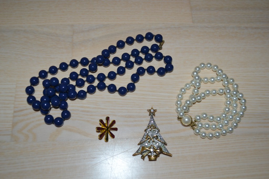 Lastly, I picked up these four pieces of jewellery. The flower brooch is a charity brooch for cancer that is released in a slightly different variation each year in Denmark. I think mine is broken though, which is sad, because I only got to wear it once. The blue pearl necklace, the pearl bracelet, and the Christmas tree brooch are all second hand pieces.