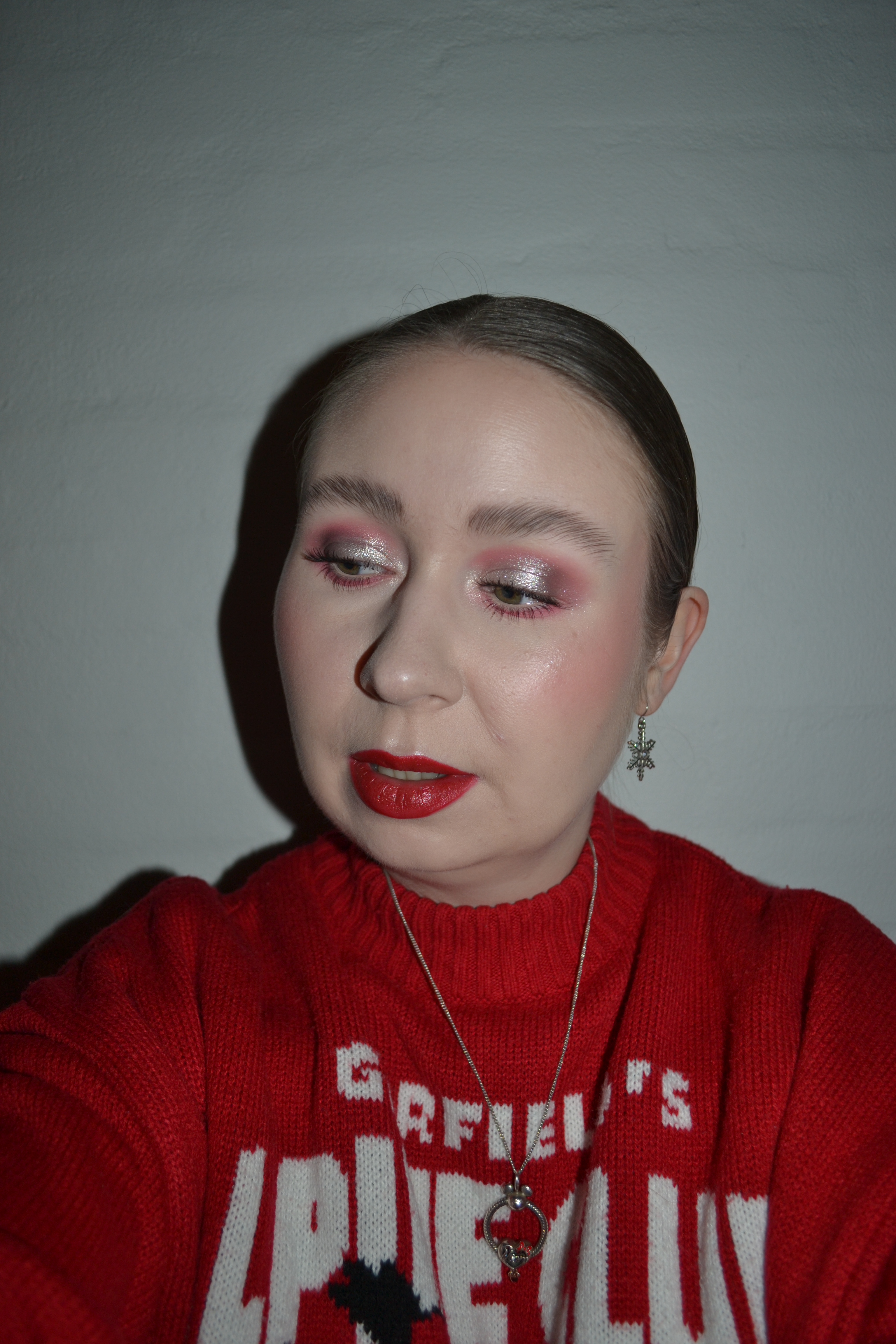 (Base: primer – e.l.f Cosmetics Power Grip primer, foundation – Rare Beauty Positive Light tinted moisturizer (shade: 14W), concealers – Rare Beauty Positive Light under eye brightener (shade: Light) + Huda Beauty #FAUXFILTER Luminous Matte liquid concealer (shade: 1.3G Marshmellow), powders – Laura Mercier Translucent Loose Setting Powder Tone Up in Rose + e.l.f. Cosmetics Halo Glow setting powder in Light. Face make-up: bronzer – Whats Up Beauty Cheeque Terre bronzer in 10 Light, blushes – NABLA Close-Up Blurring powder blush in Endorphin + Clinique Cheek Pop Pearl blush in 05 Ruby Pop, highlighter – Simply Posh Cosmetics Cozy Up cheek palette (shade: Snowed In). Eye make-up: base – MAC Pro Longwear Paint Pot in Painterly, eyeshadows – Essence Soft Touch eyeshadow in 01 The One + Give Me Glow Christmas Morning palette (shades: Cozy Fire + Chimney + Santa’s Sleigh) + Simply Posh Cosmetics Cozy Up cheek palette (shade: Snowed In – inner corners), mascara – L’Oréal Panorama volume million mascara in Black, eyeliner – MAC Studio Chromagraphic pencil in NC15/NW20. Eyebrows: NYX Lift & Snatch! Brow Tint Pen in Ash Brown + e.l.f. Cosmetics Brow Lift. Lips: Rare Beauty Kind Words matte lip liner in Devoted + MAC Regal Red lipstick)