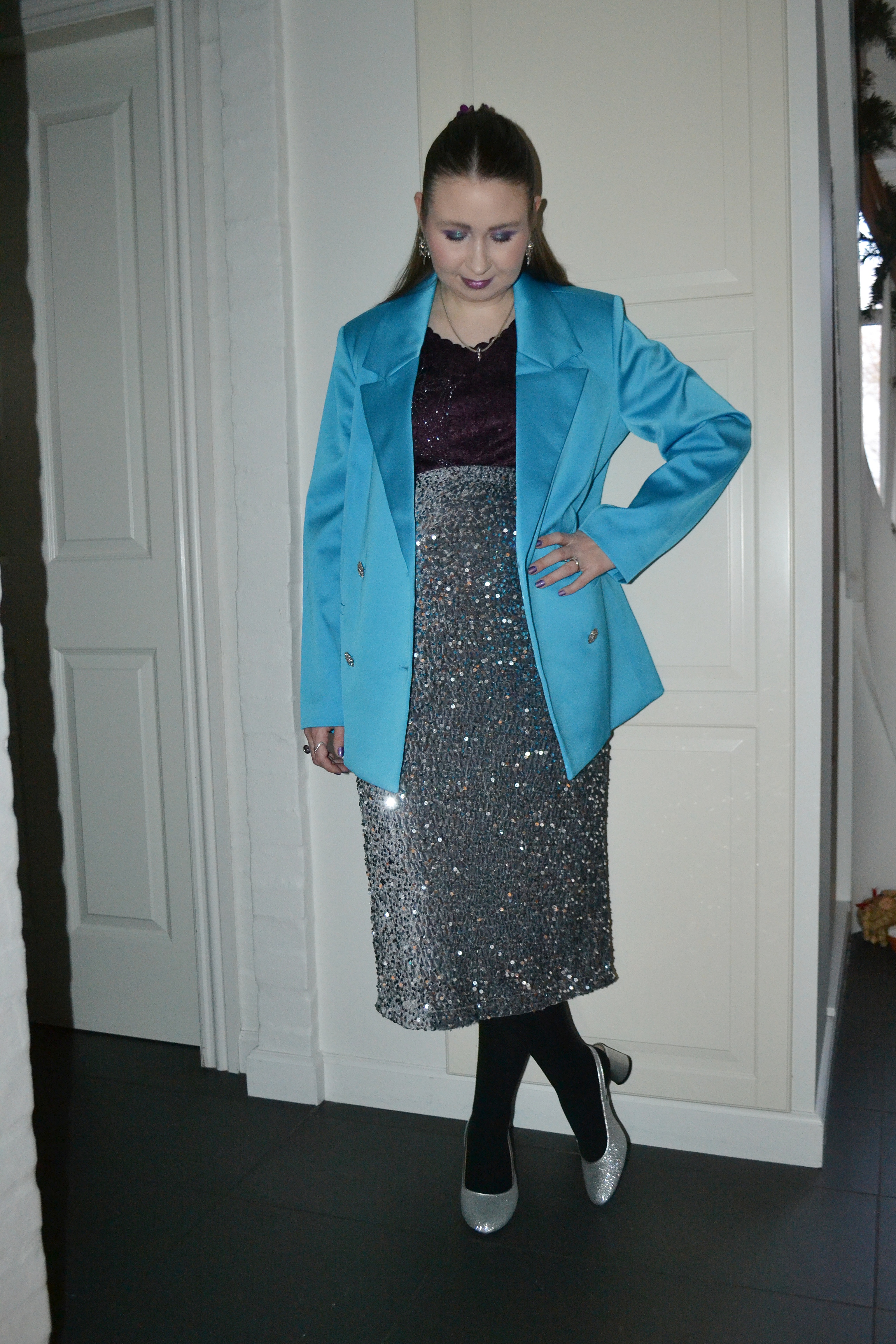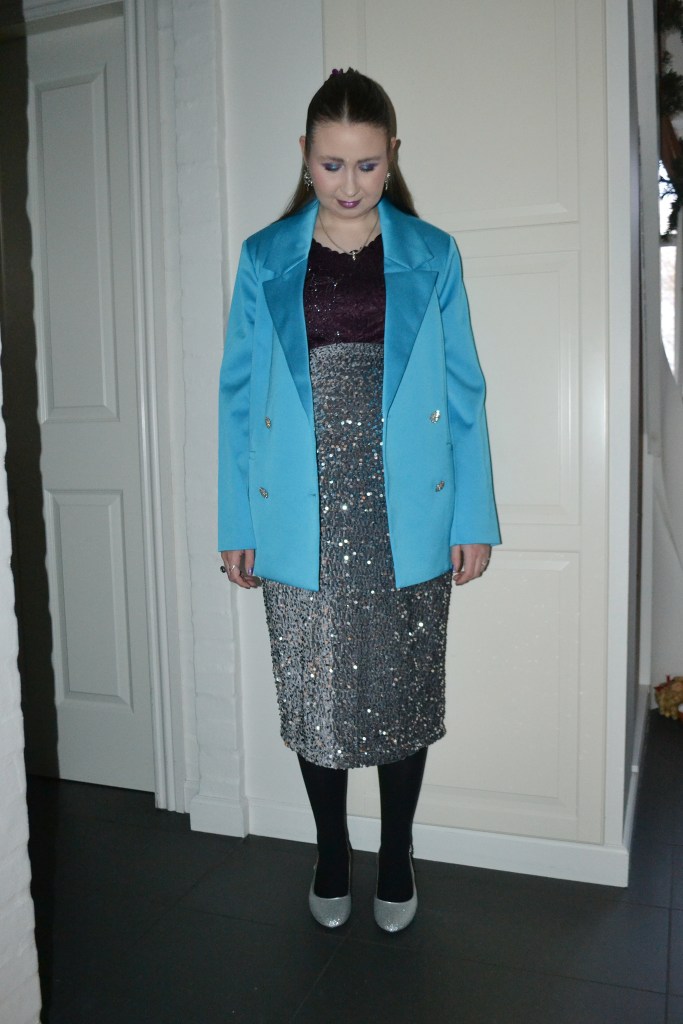 Here’s what I wore on New Year’s Eve. I obviously had to wear the sequin maternity skirt again on New Year’s Eve, and I styled it with dark purple and turquoise, which I thought was fitting for an evening look.
