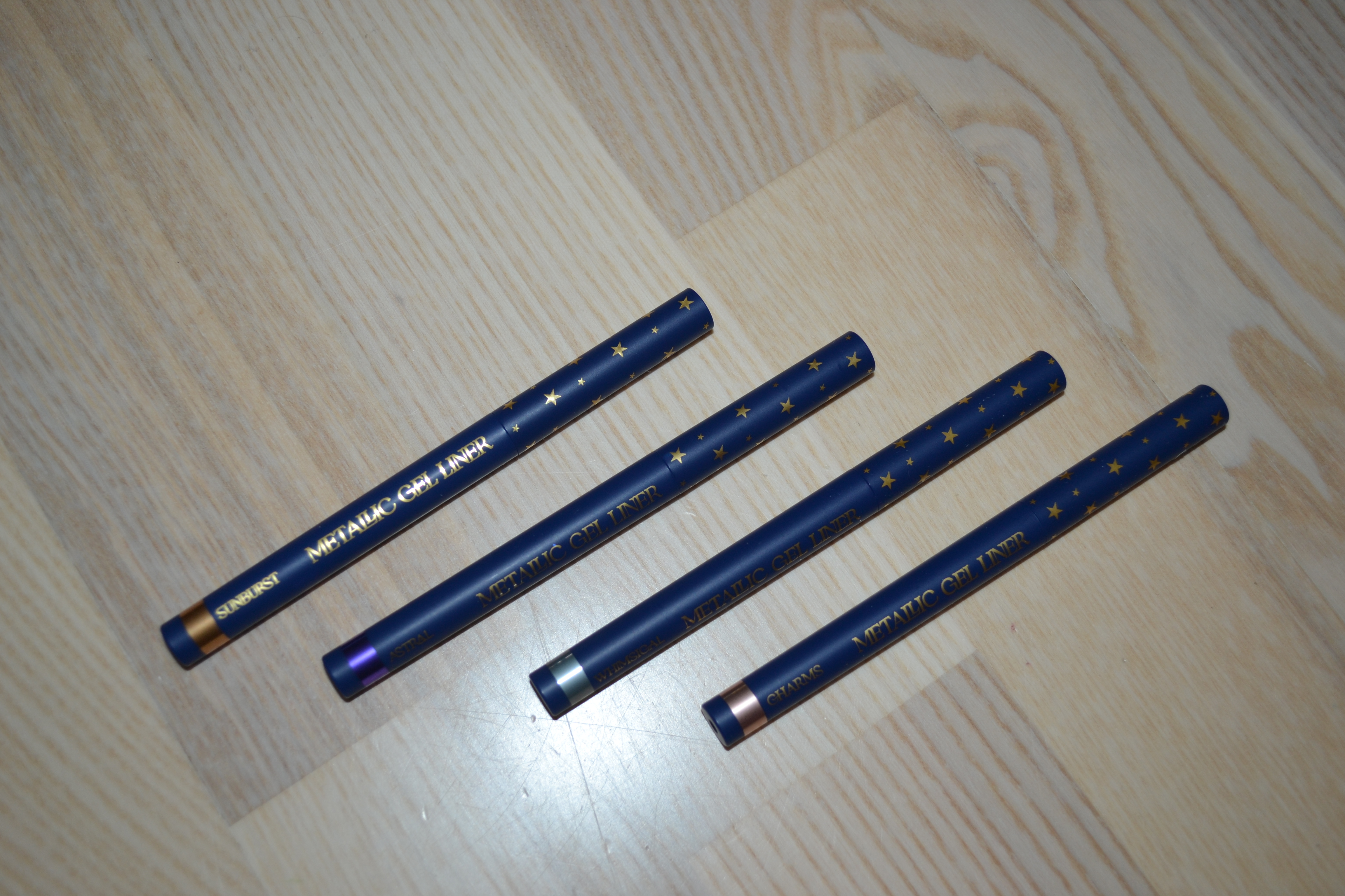 So far, I really like the metallic gel liners. The shades are called (from left to right) Sunburst, Astral, Whimsical, and Charms.