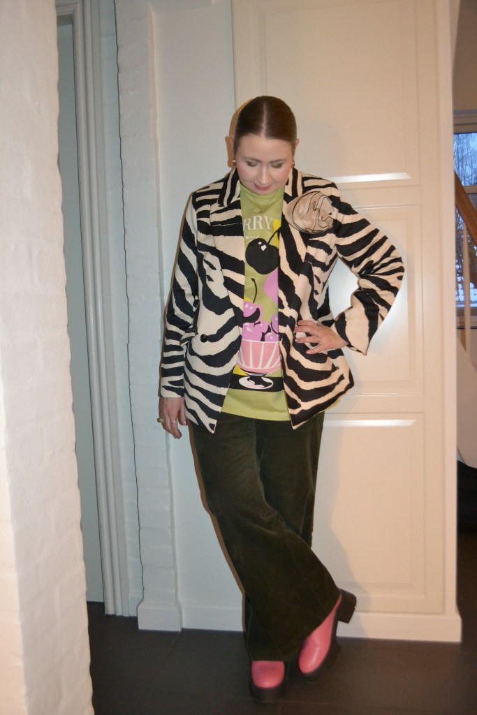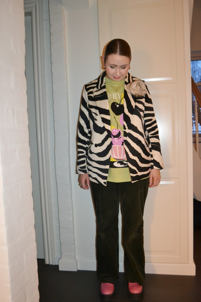 (Blazer + flower pin – H&M, T-shirt + boots – Asos Design, trousers – H&M MAMA)