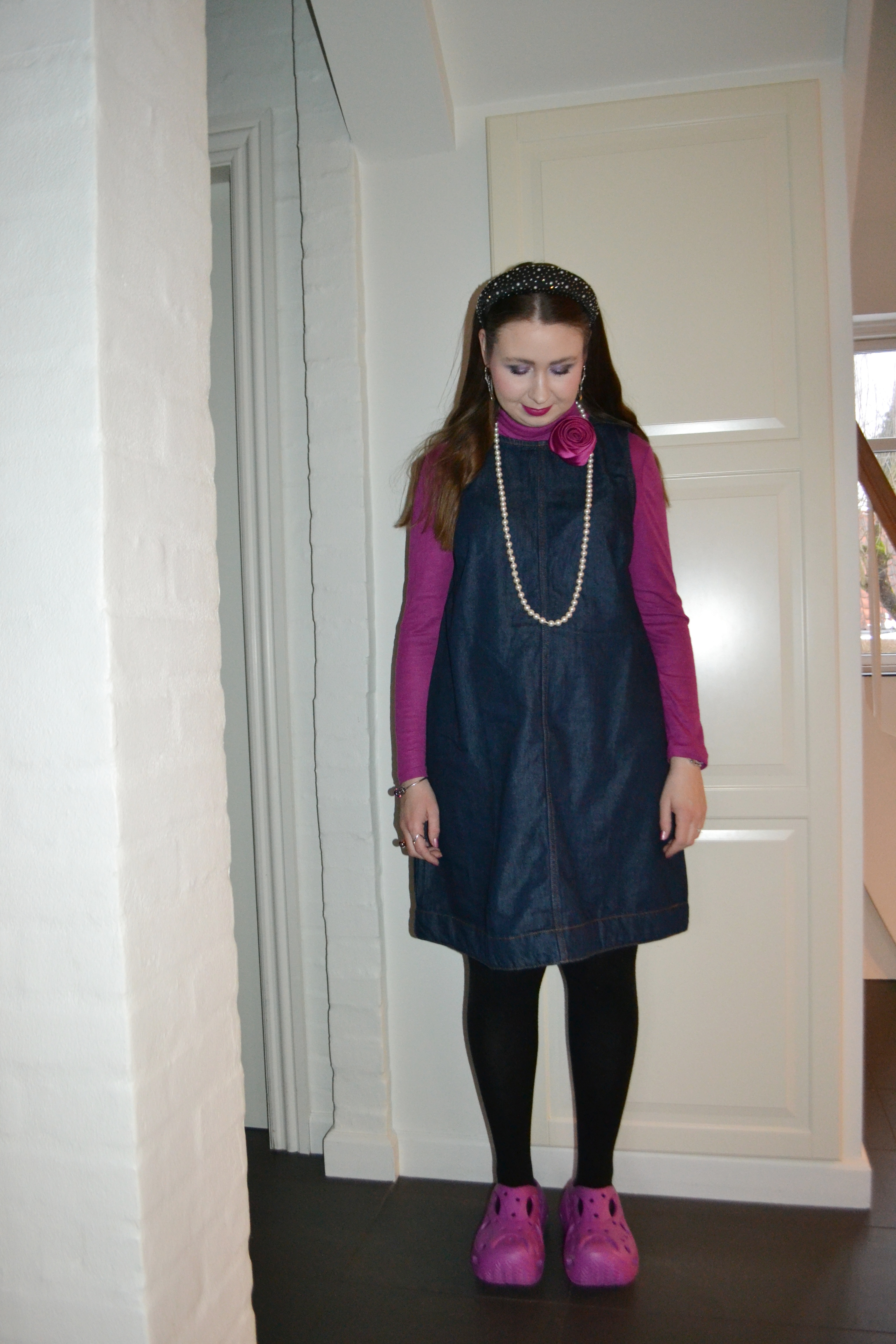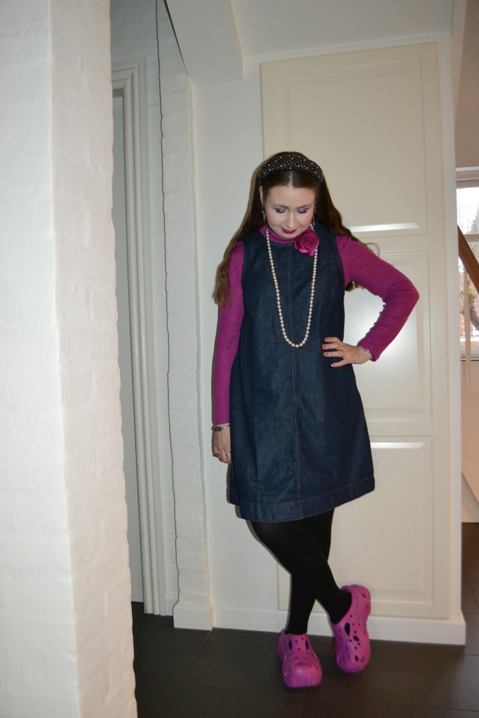 (Roll neck top – Vero Moda Maternity, flower pin – Becksöndergaard, dress + tights – H&M MAMA, shoes – Crocs)