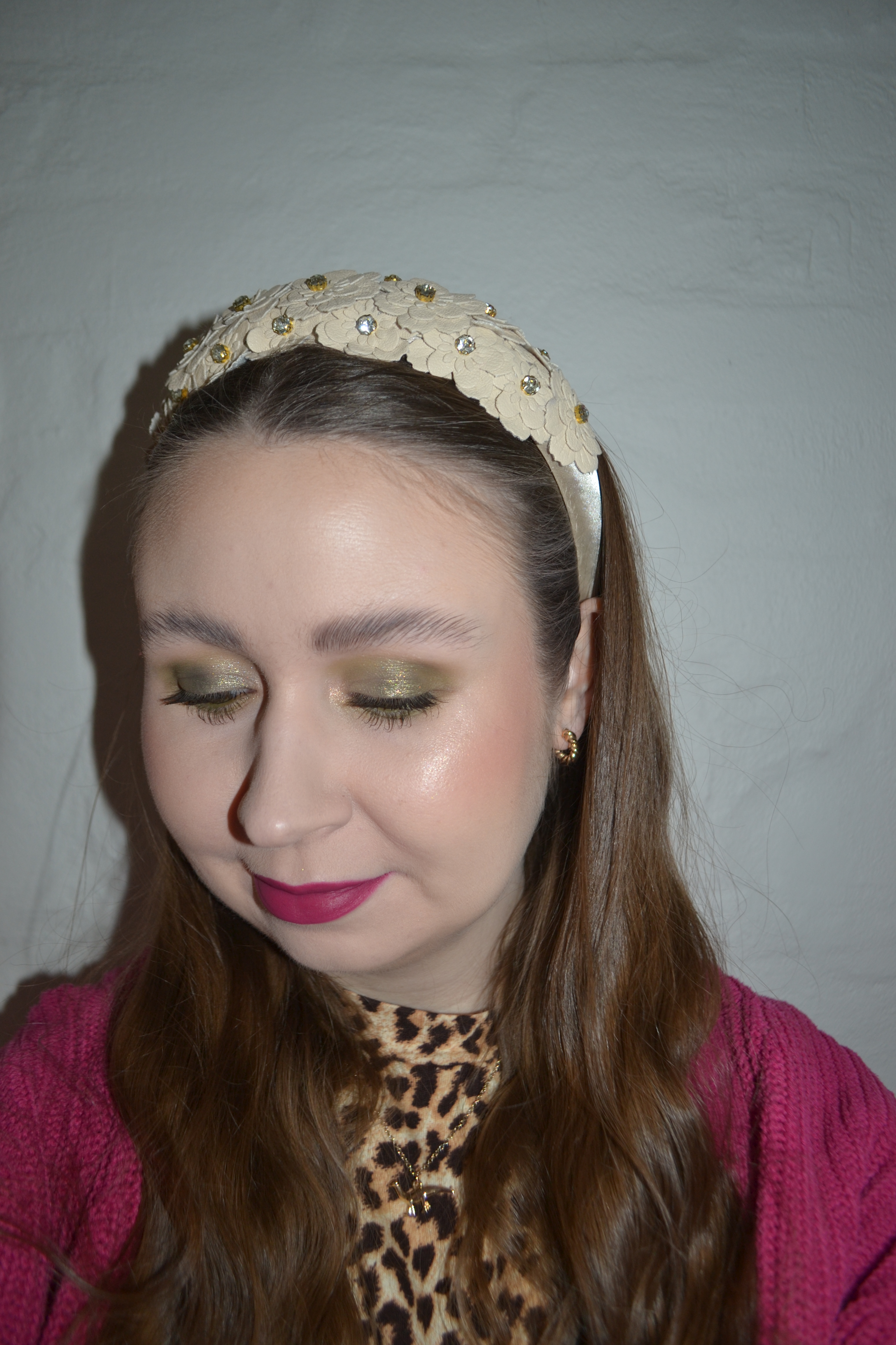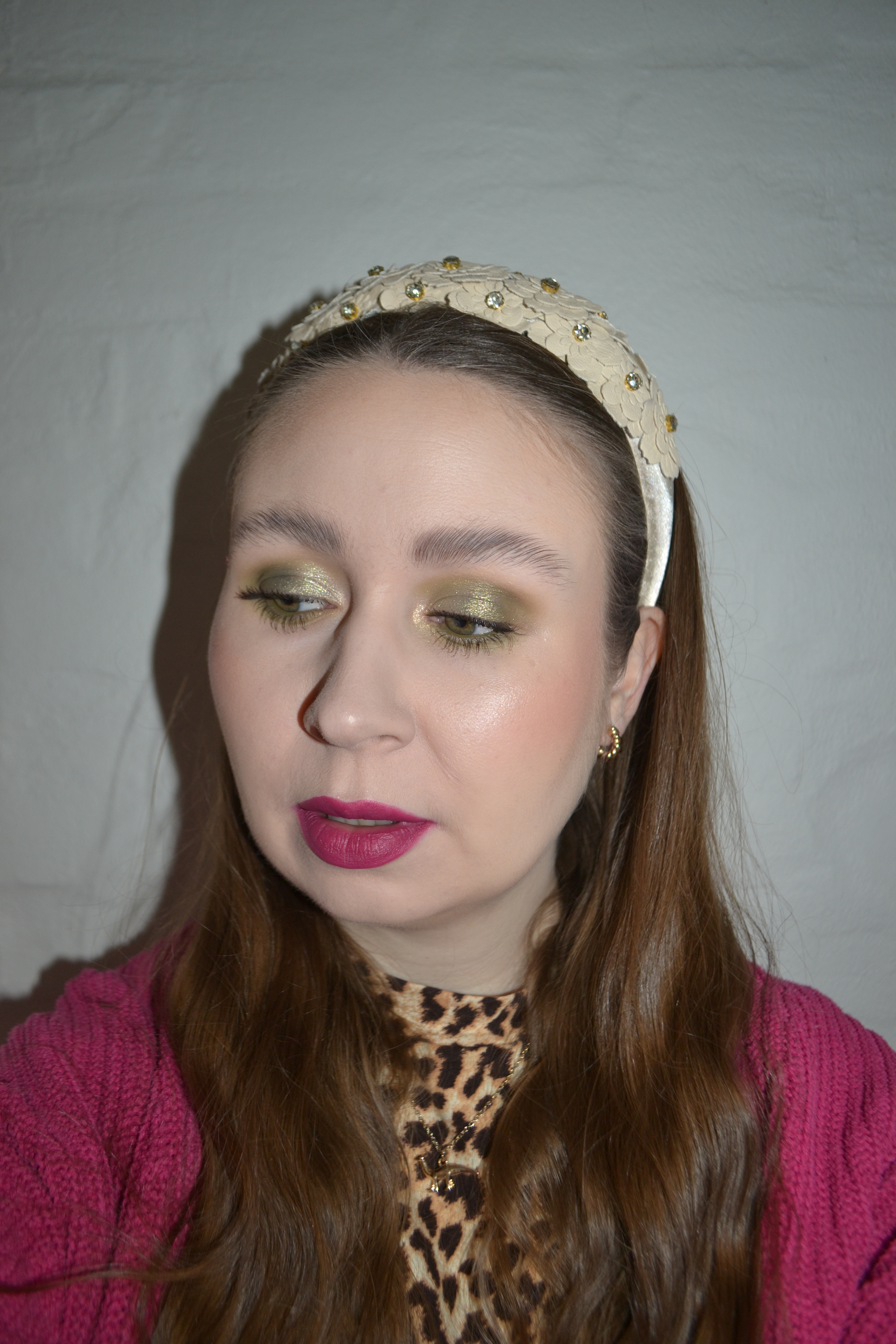 Here’s the make-up I wore with this outfit. I love an elaborate eye look, but sometimes I just want to wear a more simple, monochromatic one. I think these green tones look great paired with the berry lip.