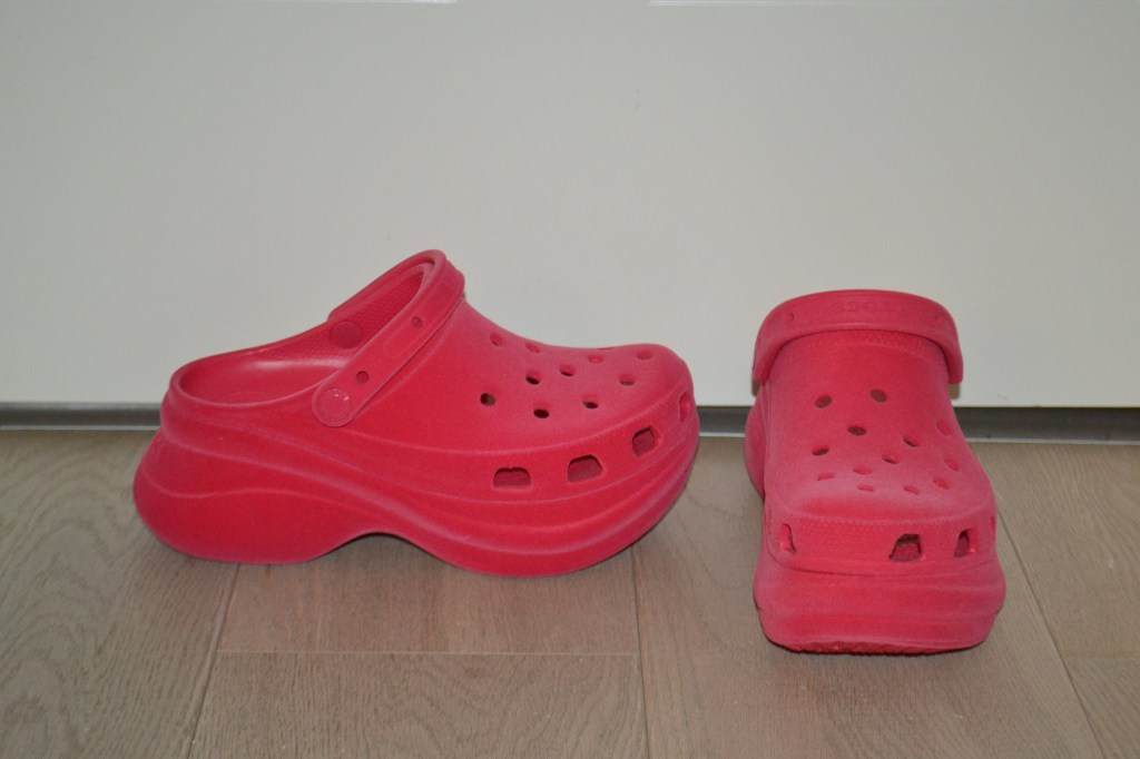 Moving on to shoes, and I’ve got three pairs to show you. These raspberry pink velvet Bae Crocs had been on my mind, since I first saw them, so when I found them on sale at Asos, it was my cue to get them.