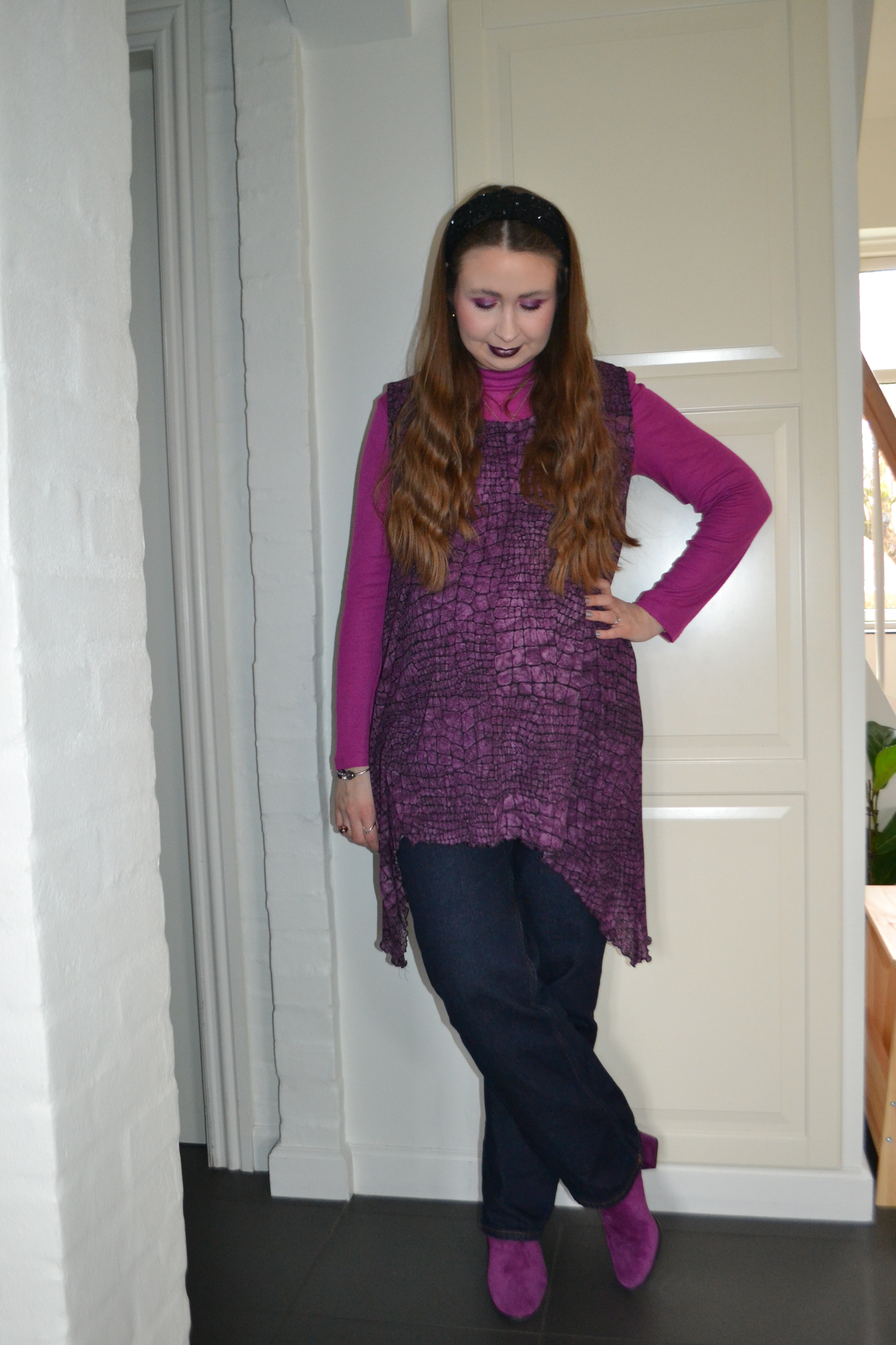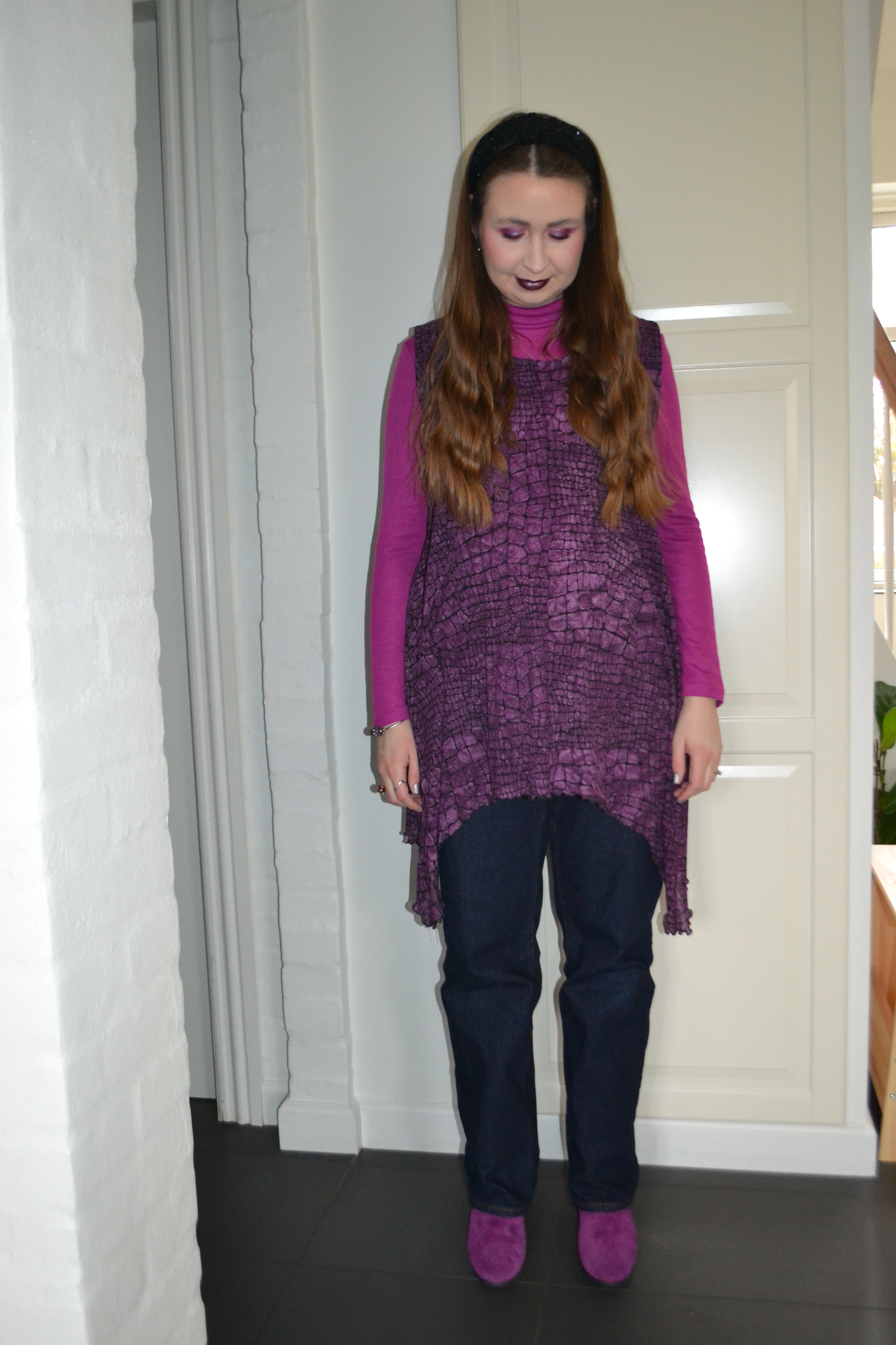 Here’s what I wore Tuesday March 10. My mum wore the tunic when she was pregnant with my youngest sister. I didn’t wear it during my first pregnancy, but I thought I would try to style it this time around and paired it with other purple pieces.