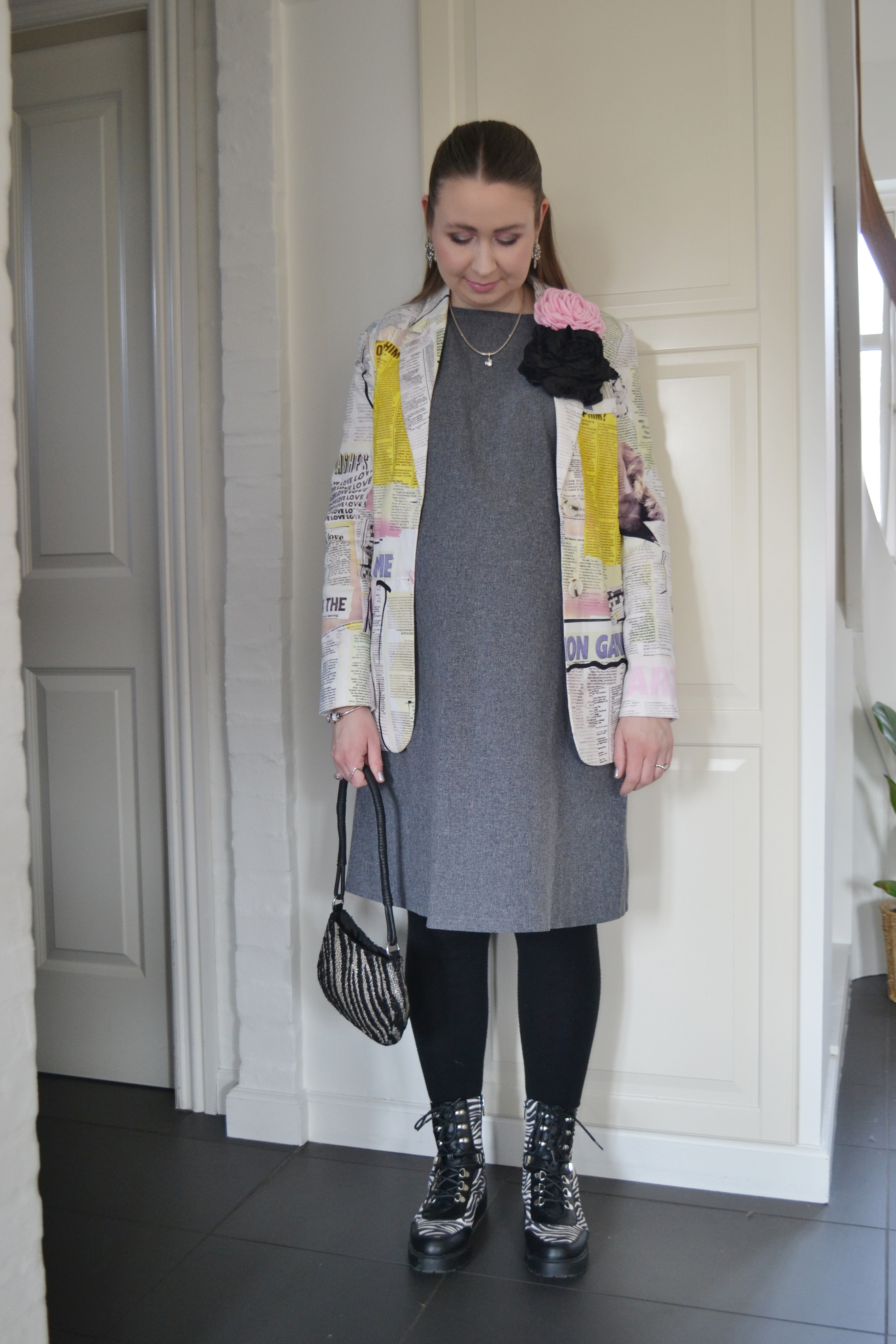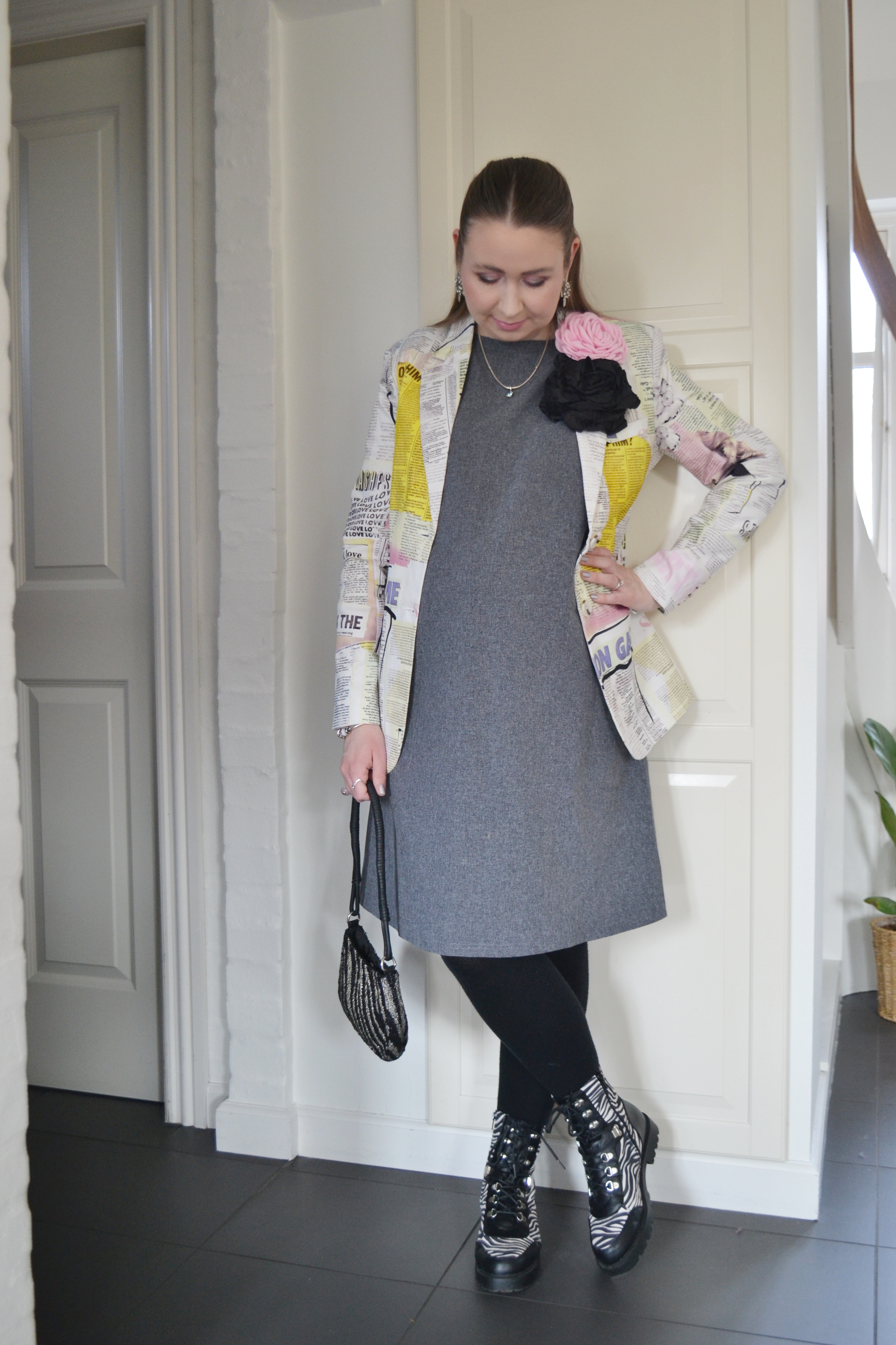 (Blazer – Desigual, pink flower pin – Black Colour, black flower pin – H&M, dress – second hand, tights – H&M MAMA, bag – Topshop, boots – Asos Design)