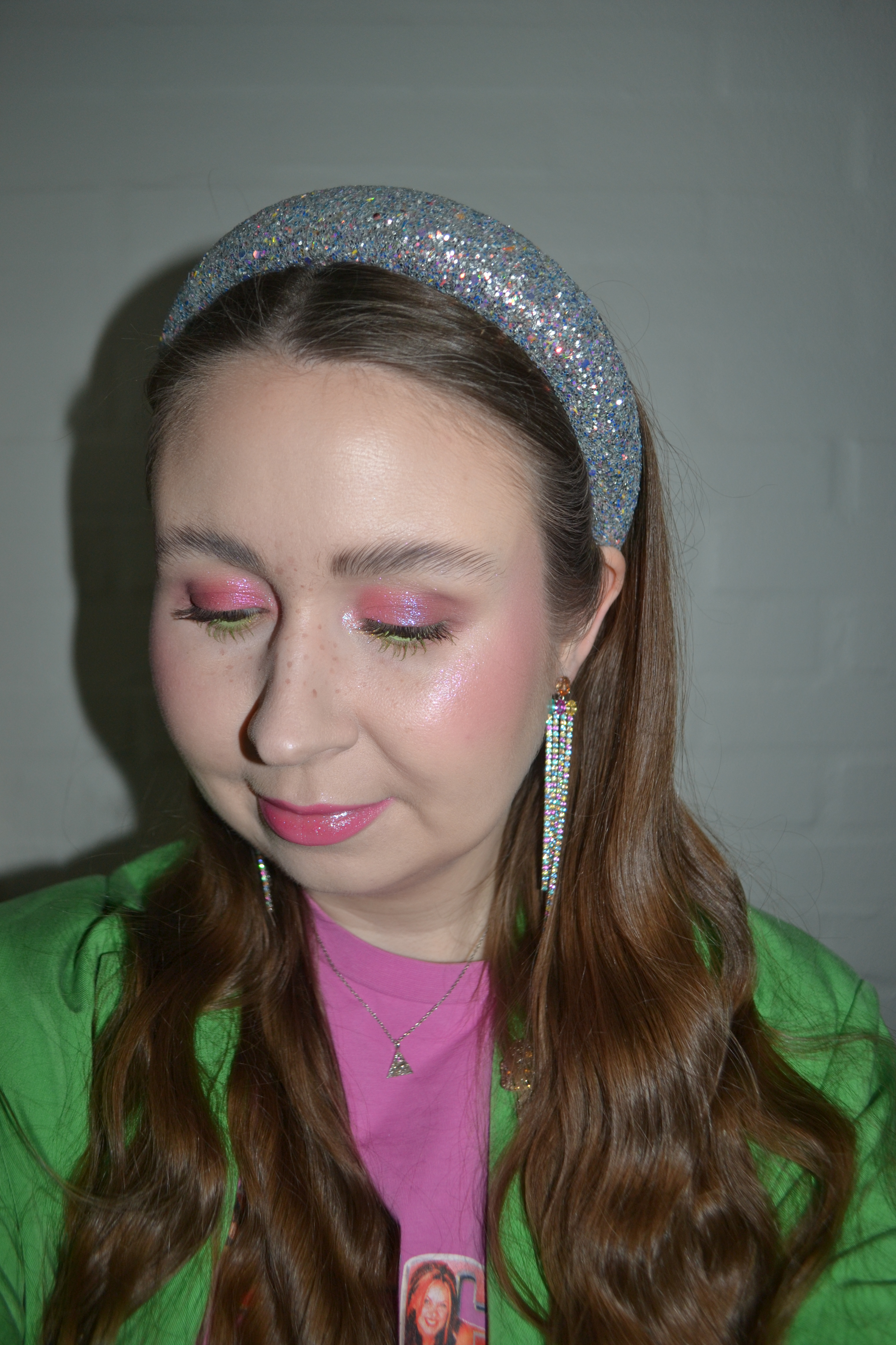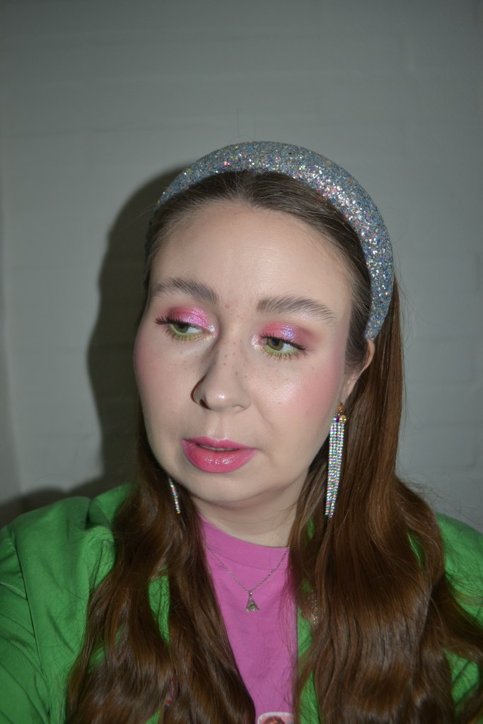Here’s the make-up I wore with this outfit. Pink and green were the obvious colours for this make-up look, and I love that it’s an overall shimmer heavy look.