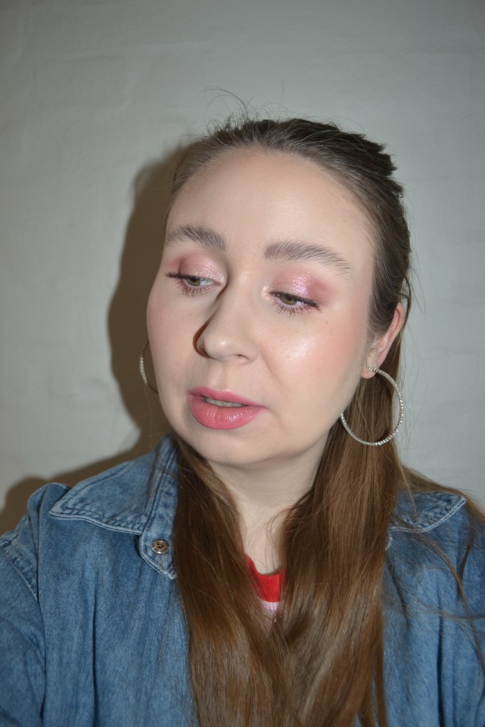 (Base: primer – e.l.f. Cosmetics Liquid Poreless Putty primer, foundation – Fenty Beauty Eaze Drop Blur + Smooth skin tint stick (shade: 2), concealers – e.l.f. Cosmetics Putty Color-Correcting Eye Brightener (shade: Fair) + Catrice Instant Bright serum concealer in (shade: 002N), powders – e.l.f. Cosmetics Halo Glow setting powder in Light Pink + Light. Face make-up: bronzer – NYX Buttermelt bronzer in 01 Butta Cup, blush – NYX Buttermelt blush in 02 Butta Together, highlighter – Essence The Jeans Club eye & face bouncy luminzer in 01 So Dazzling Denim. Eye make-up: base – MAC Pro Longwear Paint Pot in Painterly, eyeshadows – Huda Beauty Nude Light Obsessions palette (shades: 3. shade 1. row + 2. & 3. shade 2. row + 3. shade 3. row) + Essence Disney Alice in Wonderland Jelly Jewels glitter eyeshadow topper in 01 Be Adventurous, mascara – Catrice Pure Volume Magic Brown mascara (shade: 010 Burgundy Brown), eyeliner – Catrice Kohl Kajal waterproof in 170 Candy Rose. Eyebrows: NYX Lift & Snatch! Brow Tint Pen in Ash Brown + e.l.f. Cosmetics Brow Lift. Lips: Make Up For Ever Artist Color Pencil in 806 Go Ahead Pink + Essence Fruit Kiss caring lip balm in 03 Strawberry Kiss)