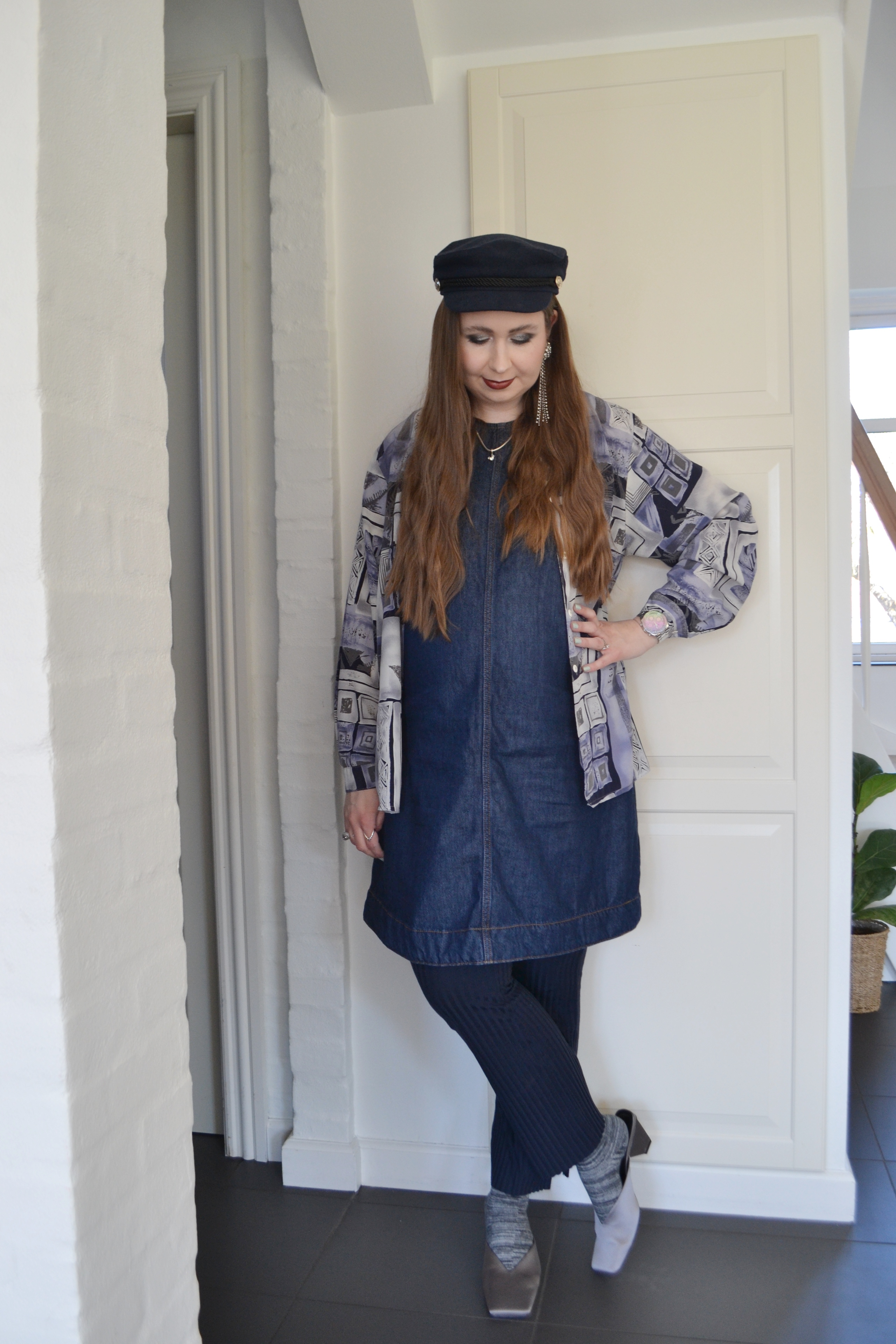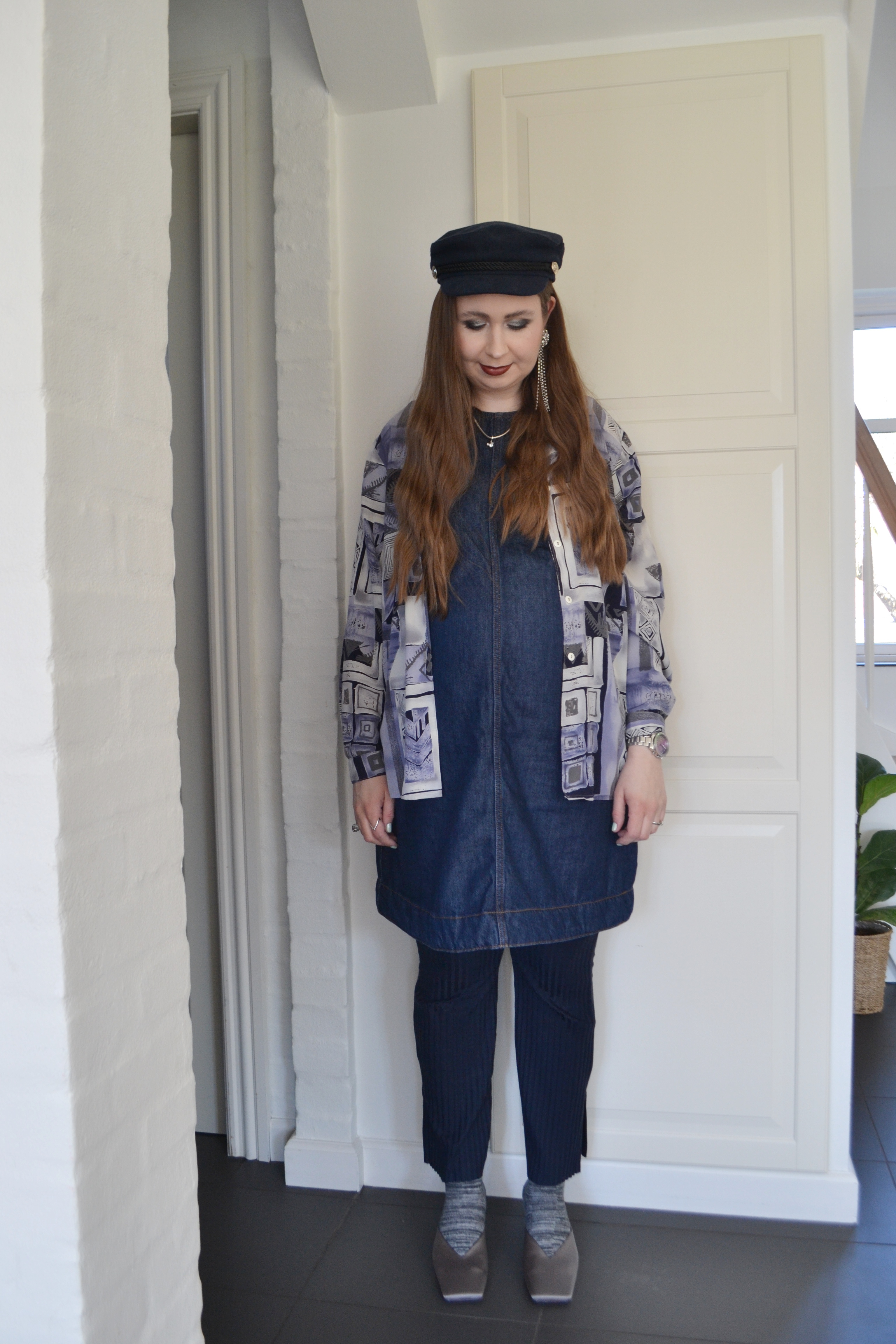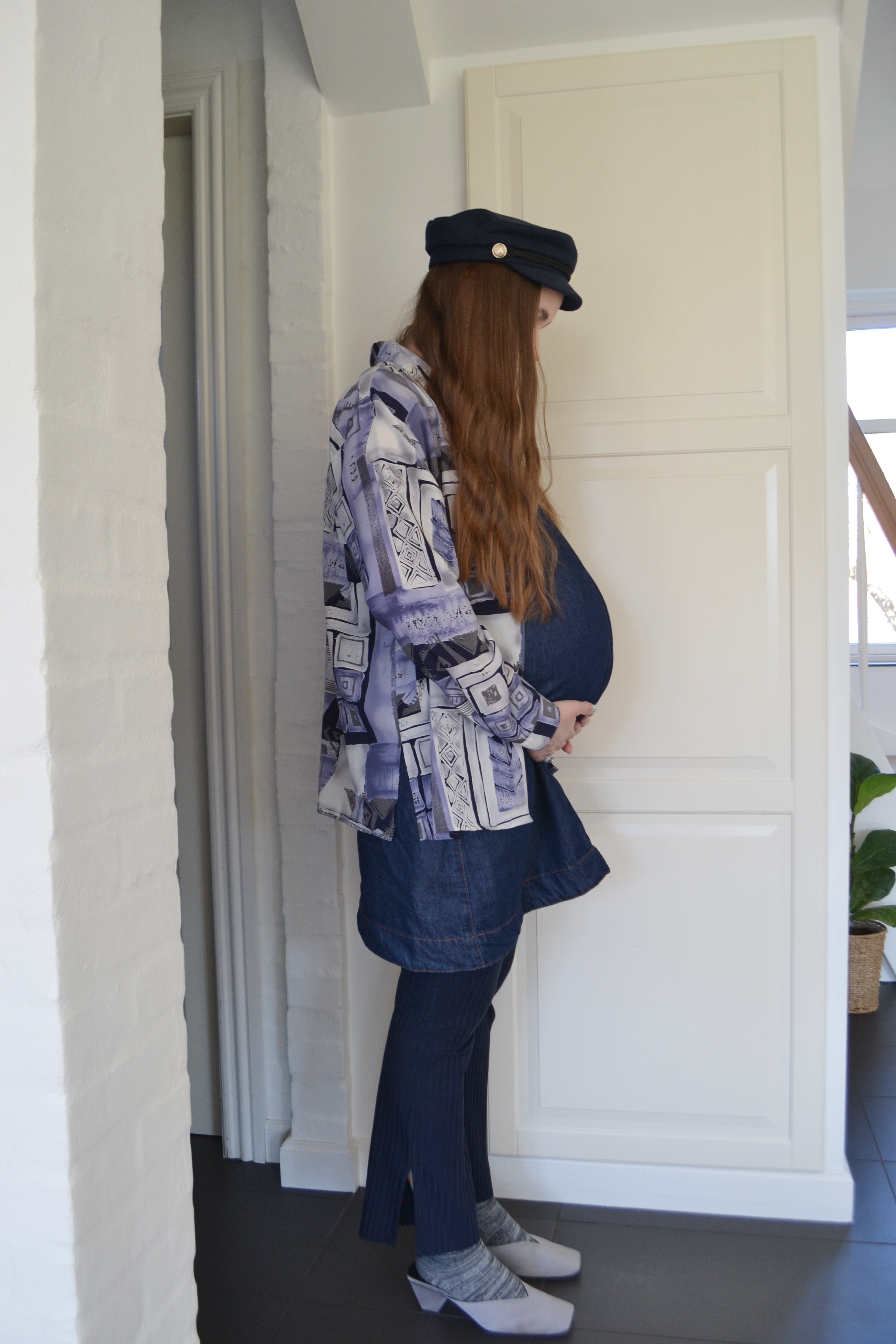 (Hat + mules – H&M, shirt – second hand, dress + leggings – H&M MAMA, socks – Monki)