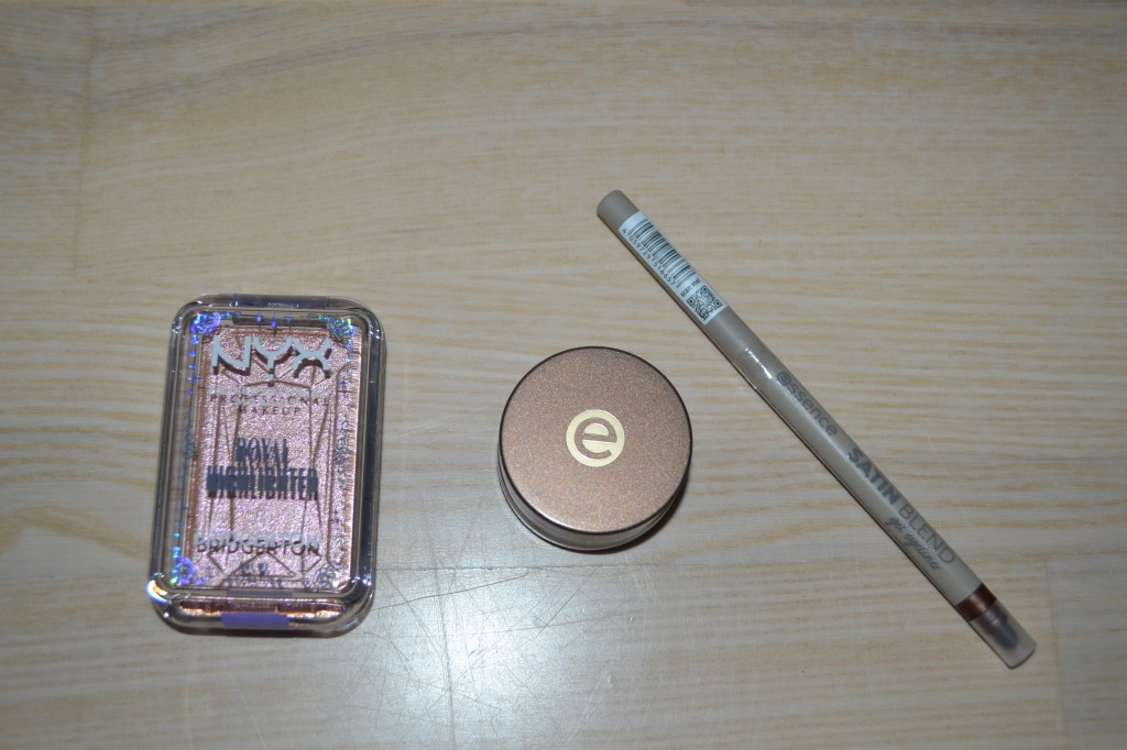 I love the Buttermelt highlighters from NYX and I love Bridgerton, so I had to have one of the Royal highlighters from the NYX Bridgerton collection. I got the shade 1 Iridescent Peach, and it’s beautiful. I also thought I would try a couple of newer products from Essence; the cream eyeshadow in 03 Oyster and the Satin Blend gel eyeliner in 03 Bronzed Shimmer.