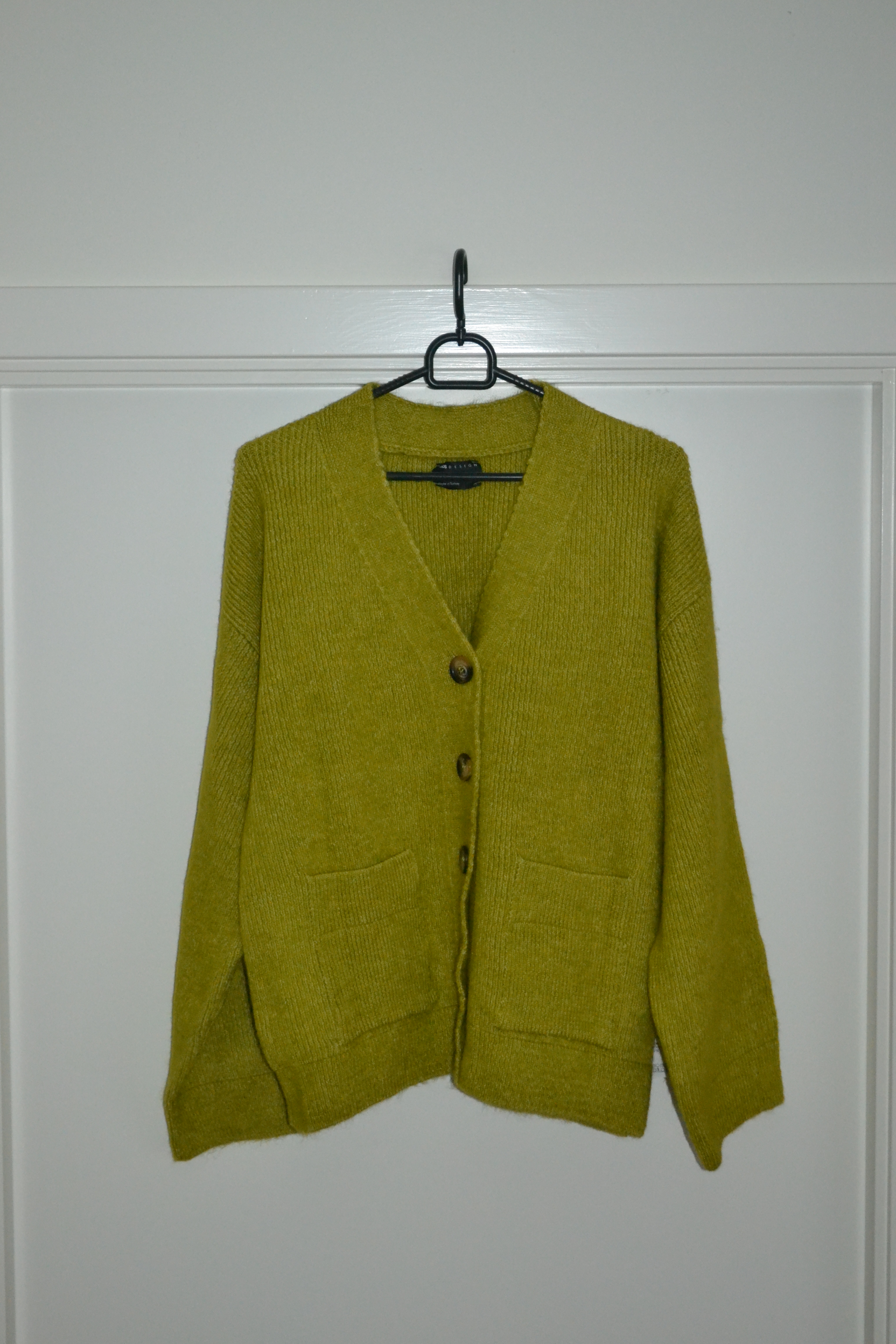 I’m really into everything lime, olive, and khaki green at the moment, so I’ve been loving this cardigan from Asos Design. Here’s my most recent outfit with this cardigan.