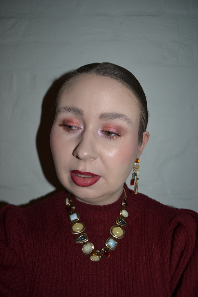 Here’s the make-up I wore with this outfit. I liked the idea of this look, but it didn’t wear that well. The satin eyeshadows creased on me quite quickly, and the lip oil went outside my lip line even though I was wearing a lip liner.