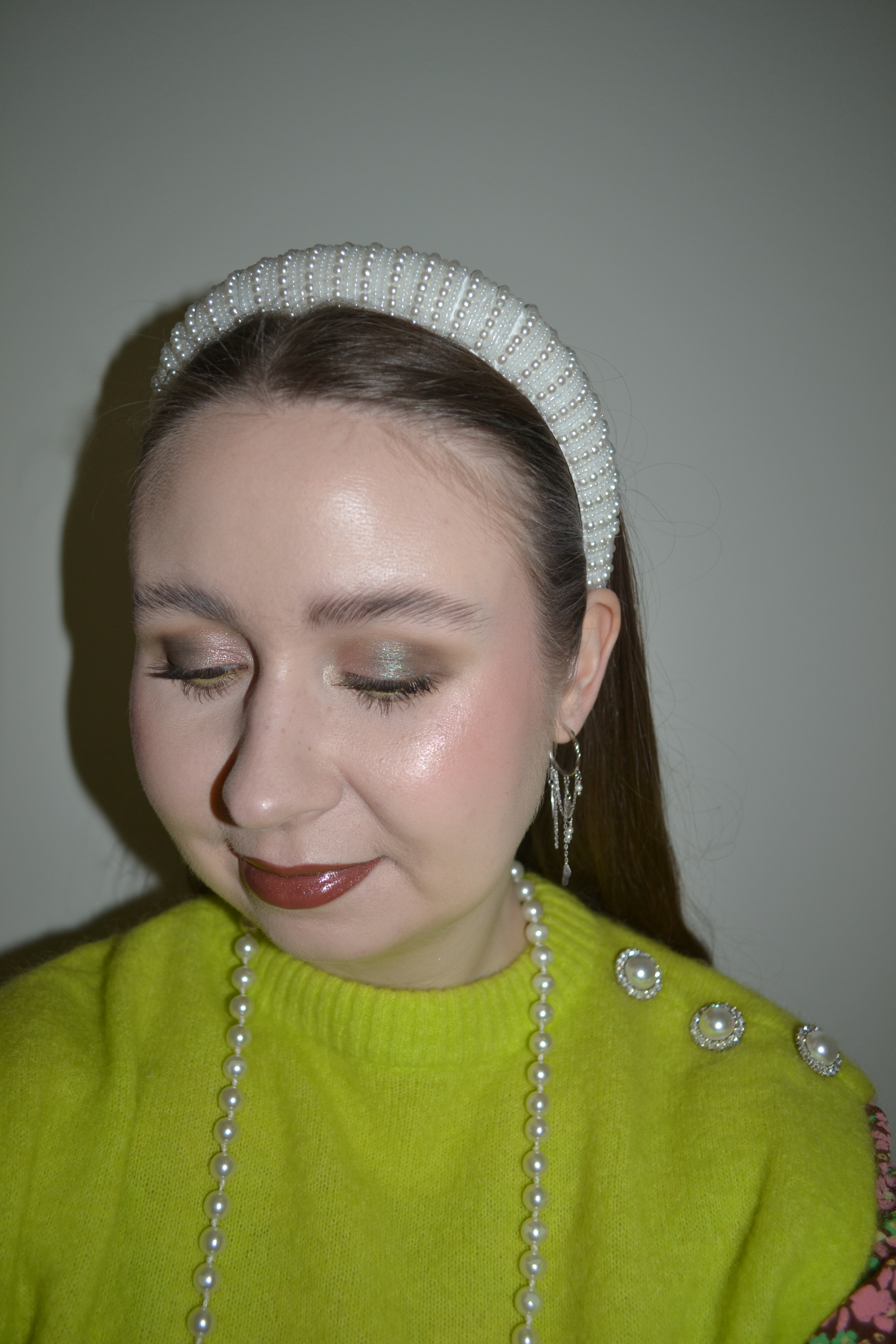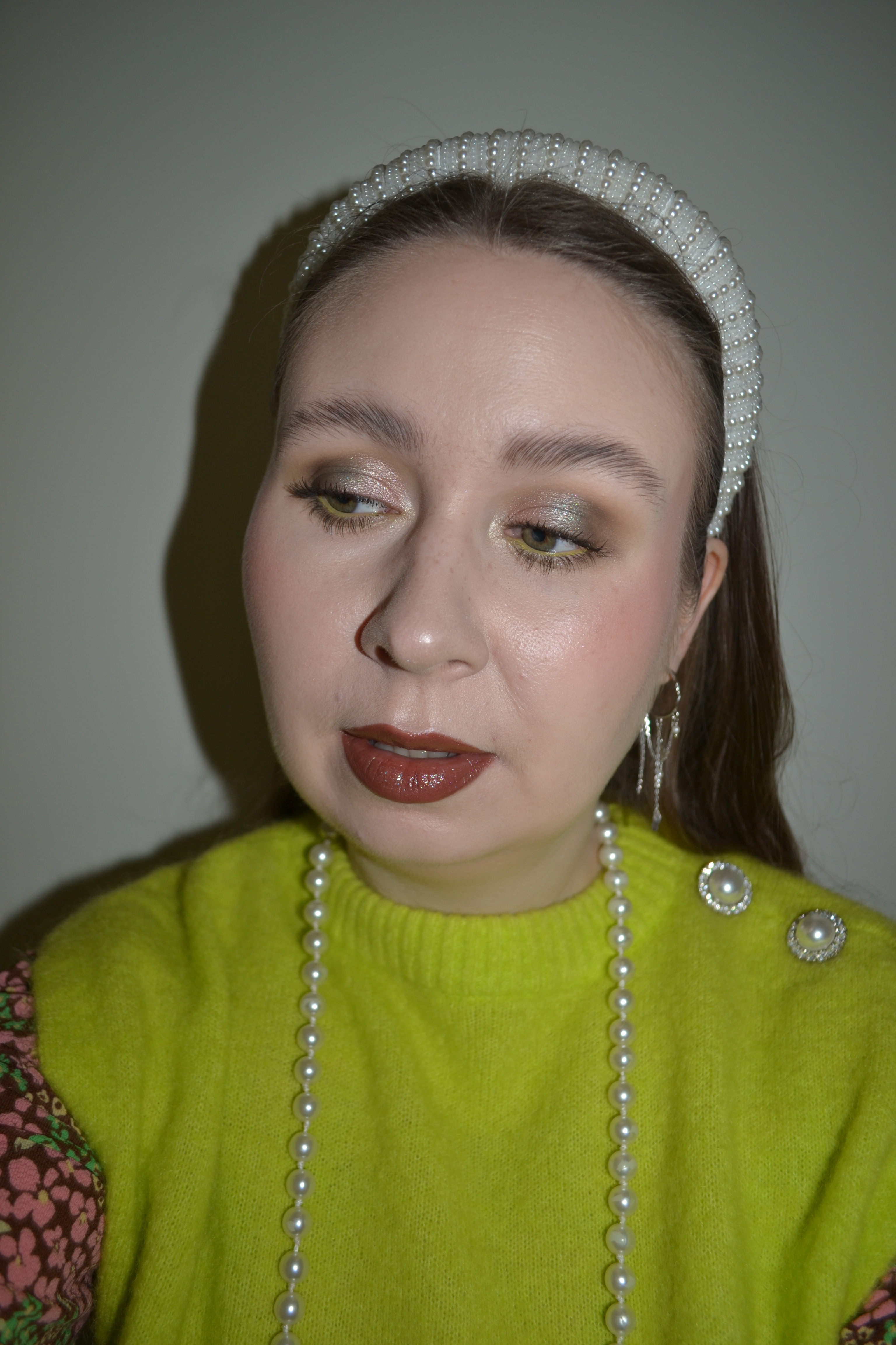 (Base: primer – e.l.f Cosmetics Power Grip primer, foundation – Rimmel Kind & Free Glow It Up moisturising skin tint (shade: Fair Porcelain 01), concealers – Rare Beauty Positive Light under eye brightener (shade: Light) + Danessa Myricks Beauty Yummy Skin Lift & Flex concealer (shade 2), powder – e.l.f. Cosmetics Halo Glow setting powder in Light, freckles – NABLA Freckle Maker. Face make-up: bronzer – Catrice Butter Like Bronze & Contour palette in 010 Born To Shape (both shades), blush – BH Cosmetics x Doja Cat Flora powder blush trio in Poppy (shades: 2 + 3), highlighter – Natasha Denona Pastel Plexi Glow highlighter. Eye make-up: base – MAC Pro Longwear Paint Pot in Painterly, eyeshadows – Singe Beauty Paisley Hoot palette (shades: Shag Rug + Bell Bottom + Platforms + Velvet + Chevron + Groovy + Disco), mascara – Maybelline Lash Sensational Sky High mascara (shade: Green Altitude), eyeliner – NYX Epic Wear Liner Stick in Cosmic Yellow. Eyebrows: NYX Lift & Snatch! Brow Tint Pen in Ash Brown + e.l.f. Cosmetics Brow Lift. Lips: Singe Beauty Evocative lip liner in Tender Teak + Nomad Cosmetics Witch City Salem Spellbinding lipstick in Witching Hour)