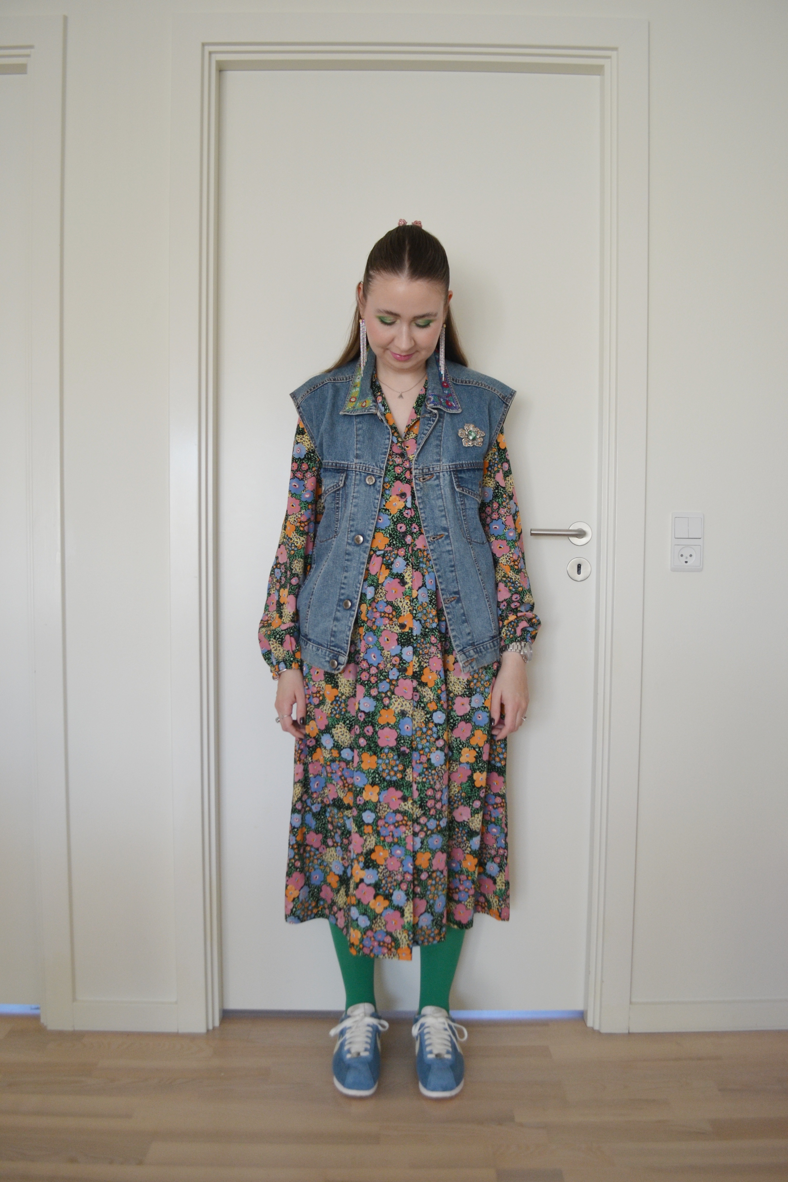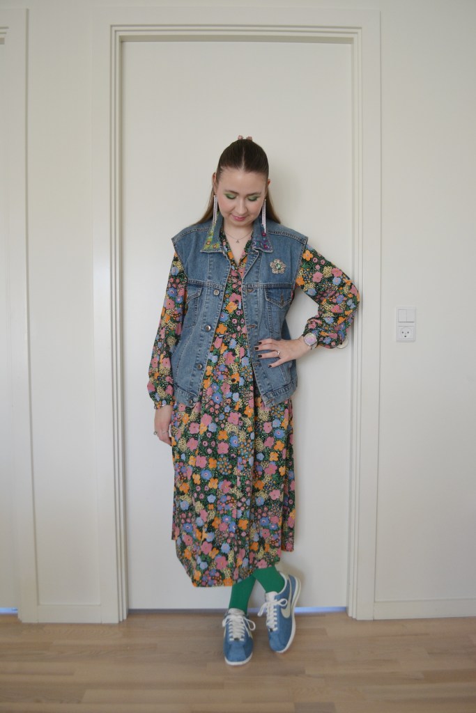 (Denim vest – second hand, dress – Monki, tights – Sneaky Fox, sneakers – Nike)