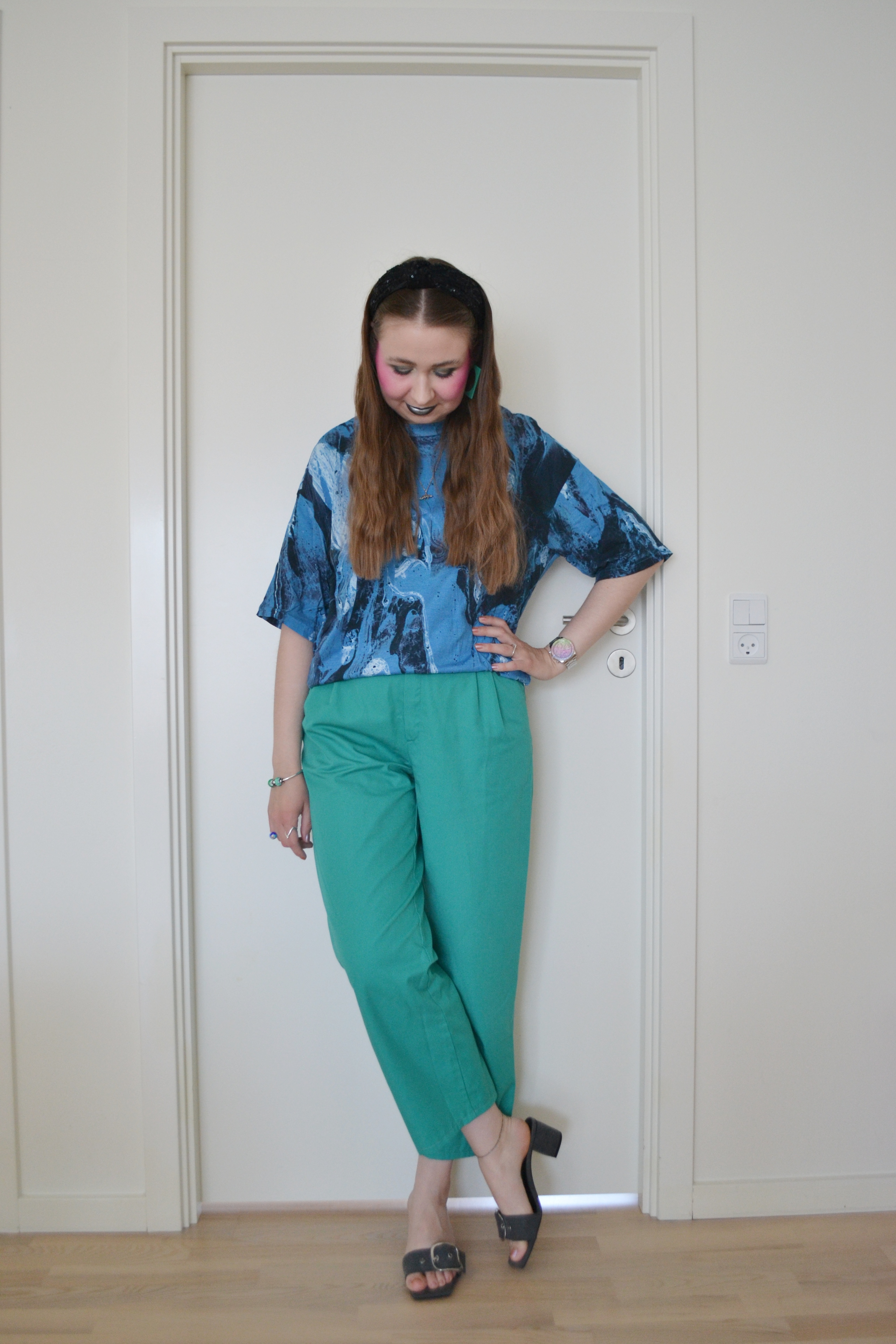 Here’s what I wore Thursday June 19. I really like this blue and green colour combo, but sadly the purple pink intense blush ruins the whole look at bit for me. I’ll talk a bit more about the blush fail in the upcoming make-up post.